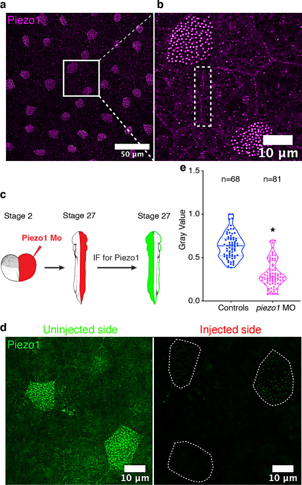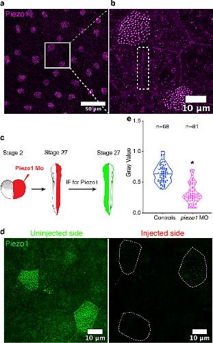 Figure 5. Piezo1 fine tunes centriole amplification and the scaling relation with apical area in the embryos.(a) Mature epidermal MCCs marked with anti-Piezo1 antibody (magenta) and chibby-GFP (centrioles, green) in X. tropicalis embryos. XZ axis shows that Piezo1 localizes at the same plane as centrioles. Quantitation of (b) centriole number and (c) apical area in MCCs across different treatments that affect Piezo1 levels (MO or CRISPR) or function (GSMTx4). Dashed lines indicate the median values of controls. * indicates statistical significance at p < 0.05. The statistical comparison between the treatments is done using the Brown-Forsythe and Welch ANOVA test followed by Dunnett's T3 multiple comparisons test. n = number of cells collected from 12 to 20 embryos. MCCs marked with chibby-GFP (centrioles), and phalloidin (F-actin) in (d) Standard control MO, (e) piezo1 MO, (f) piezo1 CRISPR, and (g) GSMTx4. Regression plot demonstrating the positive correlation between apical area and centriole number in mature MCCs of controls (blue) and (h) standard control MO (green) compared to loss of correlation in (i) piezo1 MO (magenta), (j) piezo1 CRISPR (red), and (k) GSMTx4 (orange). The data is uploaded as source data 5. Figure 5âsource data 1. Source data related to Figure 5.Figure 5âfigure supplement 1. Piezo1 localization at the cell junctions and the bases of cilia in the MCCs.(a) Mature epidermal MCCs stained using anti-Piezo1 antibody. Box region (b) shows MCCs at increased magnification. Dashed box in (b) indicates the localization of Piezo1 at cell junction. (c) Experimental design to test the specificity of Piezo1 antibody using a MO based knockdown approach at two-cell stage. (d) Mature epidermal MCCs marked with Piezo1 antibody in a single embryo injected with piezo1 MO in one cell at two-cell stage as shown in (c). (e) Quantitation of Piezo1 signal at the centrioles between uninjected (control) and morpholino oligo injected sides. * indicates statistical significance at p < 0.05. The statistical comparison between the treatments is done using an unpaired t test. n = number of cells collected from 10 to 15 embryos. The data is uploaded as source data 5. |