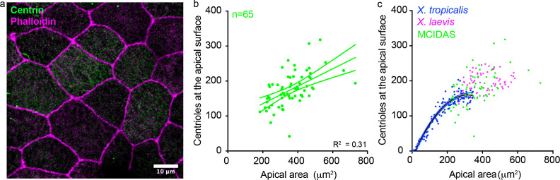 Figure 1—figure supplement 1. Relation between centriole number and apical area in goblet cells converted to MCCs in Xenopus laevis.(a) MCCs marked with centrin-GFP (centrioles, green), and phalloidin (F-actin, magenta) in Xenopus laevis. (b) Regression plot showing the relation between apical area and centriole number in MCCs induced by overexpressing mcidas in X. laevis embryos and (c) comparison to control X. laevis and X. tropicalis embryos. n = number of cells collected from five embryos. The data is uploaded as source data 1. |