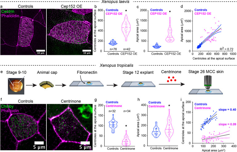 Figure 2. Perturbation of centriole amplification affects apical area contextually.(a) Mature (Step 4) epidermal MCCs marked with chibby-GFP (centrioles, green), and phalloidin (F-actin, magenta) in control and Cep152 overexpressed (OE) embryos. Quantitation of (b) apical area and (c) centriole number in MCCs of control and CEP 152 OE embryos at stage 28. (d) Regression plot showing the positive correlation between apical area and centriole number. (e) Experimental design to block centriole amplification in MCCs using Centrinone in animal caps. We dissected the animal caps at stage 8â9 and tethered them to slides using fibronectin. At stage 14 (based on unmanipulated sibling embryos), we exposed the caps to Centrinone until their unmanipulated sibling embryos reached stage 25â26. (F) Epidermal MCCs marked with chibby-GFP (centrioles, green), and phalloidin (F-actin, magenta) in control and Centrinone-treated animal caps. Quantitation of (g) apical area and (h) centriole number in MCCs of control and Centrinone-treated animal caps. (i) Regression plot showing the loss of correlation between apical area and centriole number in Centrinone-treated MCCs. * indicates statistical significance at p < 0.05. The statistical comparison between the treatments (b, c, g, h) is done using an unpaired t test. R2 is the correlation coefficient. n = number of cells collected from 10 to 15 embryos. The data is uploaded as source data 2. Figure 2âsource data 1. Source data related to Figure 2. |