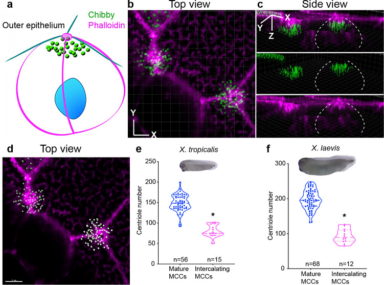 Figure 3. MCCs synthesize about half the total number of centrioles during intercalation.(aâc) Centrioles (chibby-GFP, green) and F-actin (phalloidin, magenta) in intercalating MCCs (Step 1). Dotted while lines show the border of the intercalating MCCs. (d) The same MCC is segmented using IMARIS to show individual centrioles in grey and F-actin in magenta. MCCs generate half of the total number of centrioles just prior to intercalation in (e) X. tropicalis and (f) X. laevis. * indicates statistical significance at p < 0.05. The statistical comparison between the treatments is done using an unpaired t test. n = number of cells from 10 to 15 embryos/species. The data is uploaded as source data 3. Figure 3âsource data 1. Source data related to Figure 3. |