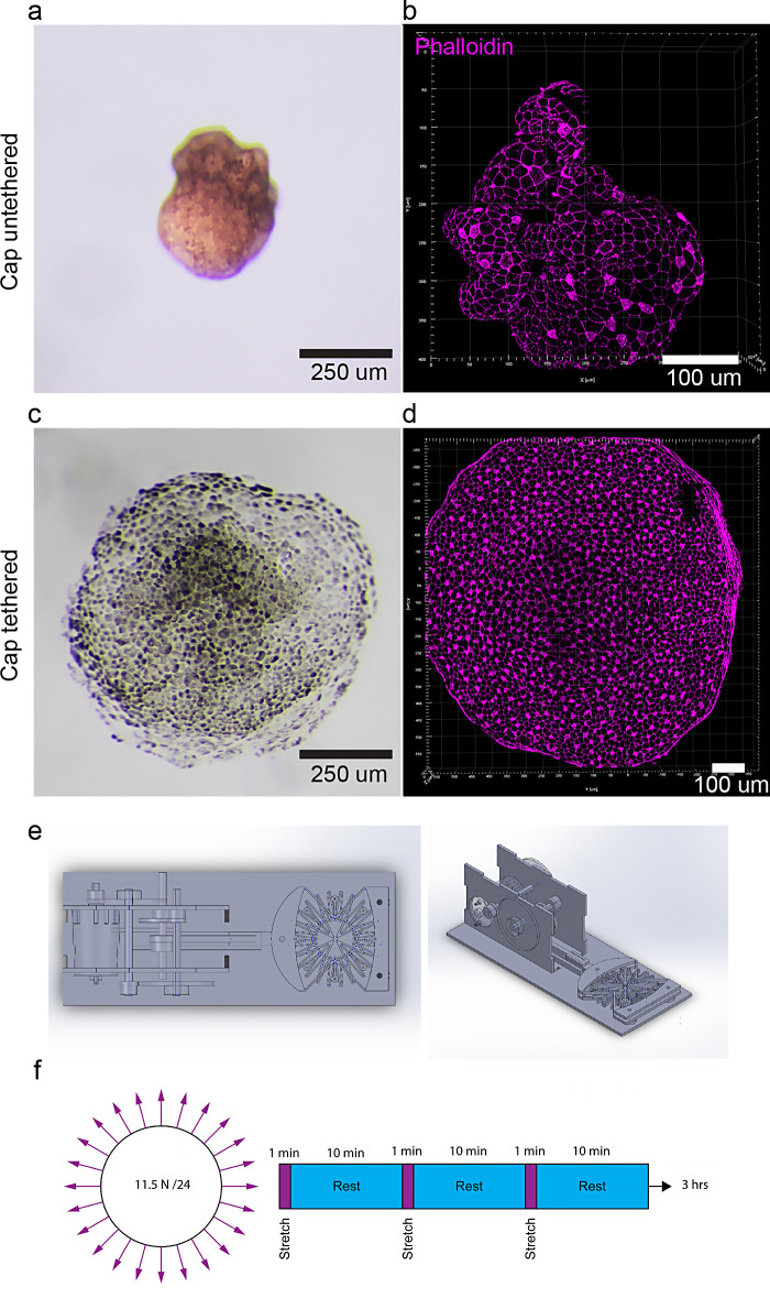 Figure 4âfigure supplement 2. Manipulation of animal caps by cell adhesion and mechanical stretcher.(a, b) Untethered (grown on agarose) and (c, d) tethered animal caps (grown on fibronectin slides) labeled with phalloidin (F-actin, magenta, b, d) at stage 28. (e) Mechanical stretcher (top view, left and side view, right). (f) Animal caps were stretched in a stepwise fashion with 1 min of stretch and 10 min of rest. The data is uploaded as source data 4. |