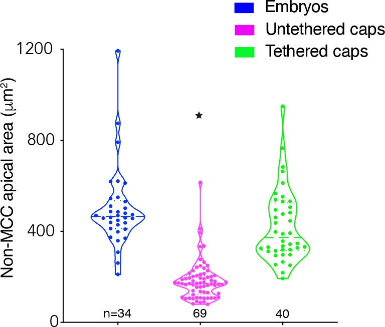 Figure 4—figure supplement 3. Apical area of non-MCCs in untethered/tethered animal caps.Quantitation of apical area in non-MCCs of control embryos (blue) and animal caps that are untethered (magenta) or tethered (green). * indicates statistical significance at p < 0.05. The statistical comparison between the treatments is done using the Brown-Forsythe and Welch ANOVA test followed by Dunnett's T3 multiple comparisons test. n = number of cells collected from 10 to 12 animal caps. The data is uploaded as source data 4. |