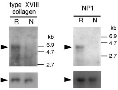 To identify candidate gene(s) involved in the tail regeneration of Xenopus laevis tadpoles, we used the differential display method to isolate four genes (clones 1, 2, 13a, and 13b) whose expression is induced in regenerating tadpole tails. Among them, clones 13a and 13b were found to encode the Xenopus homologues of the alpha1 chain of type XVIII collagen and neuronal pentraxin I, respectively. Expression of clone 2 and neuronal pentraxin I genes increased dramatically in the blastema 3 days after amputation, whereas that for the clone 1 and type XVIII collagen genes was induced gradually after amputation. In situ hybridization revealed that the neuronal pentraxin I gene is expressed specifically in the regenerating tailepidermis but not in the normal tailepidermis or the most distal margin of the tail blastema, suggesting that it has a tissue-inductive role in tail regeneration. Expression of the four genes was induced in the limb and in the tail blastema, suggesting that they are involved in the regeneration of both organs. Finally, expression of clone 2 and neuronal pentraxin I genes was scarce during embryonic stages in comparison to the tail blastema, suggesting that their main functions are in organ regeneration. Our results demonstrate unique features of spatial and temporal gene expression patterns during Xenopus tadpoletail regeneration.