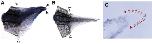 Fig. 6. Whole-mount in situ hybridization of the Xenopus NP1 gene in the regenerating tadpole tails. A,B: Whole-mount in situ hybridization was performed using Xenopus tadpole regenerating tails 7 days after amputation and antisense (A) or sense (B) digoxigenin- labeled RNA probes. The boundary between the normal tail portions and the regenerating tail is indicated by white arrowheads, and the boundary between the regenerating tail and the most distal portions is indicated by black arrowheads. C: The tadpole regenerating tail specimen stained by whole-mount in situ hybridization was sectioned to observe the inner tissues. The boundary between the most distal tip without NP1 expression (right) and the NP1-expressing regenerating tail (left) is indicated by filled red arrowheads. The portion corresponding to the distal tip is outlined by open red arrowheads.