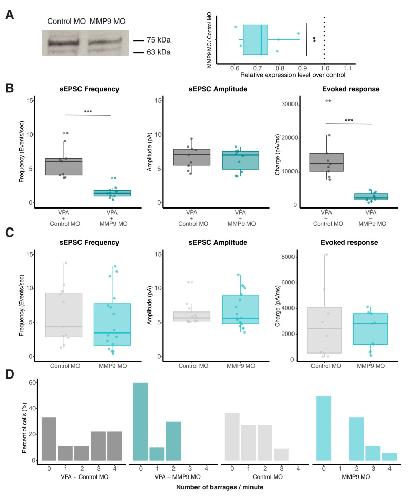 Figure 3. Morpholino targeted against MMP-9 rescues VPA-induced effects.(A) Western blot image (left) indicating MMP-9 levels (75kD band) in control (scrambled) MO and MMP-9 MO transfected groups. Boxplot (right) shows relative MMP-9 levels for control MO and MMP MO transfected tadpoles. MMP-9 MO group consistently shows relatively reduced MMP-9 levels compared to controls. The dotted line represents a ratio of 1 (no difference). The 63 kDa band is a non-specific band labeled by MMP-9 antibody that shows no change. (B) Boxplots showing sEPSC frequency, amplitude and evoked synaptic response from VPA + Control MO and VPA + MMP-9 MO groups. Frequency of sEPSCs and not amplitude are significantly enhanced in VPA + Control MO group. Total charge from evoked synaptic response is significantly higher in the VPA + Control MO compared to VPA + MMP-9 MO-treated animals. Data are represented as median ± IQR. (C) Boxplots showing sEPSC frequency, amplitude and evoked synaptic response from Control MO and MMP-9 MO alone. Control MO and MMP-9 MO alone does not differ significantly in sEPSC frequency or amplitude. MMP-9 MO alone does not show any significant effect on evoked response. Data are represented as median ± IQR. (D) Histogram showing relative barrage frequency for each group. Higher number of barrages are observed for VPA + control MO, and this effect is rescued by addition of MMP-9 MO. ** p < 0.005, *** p < 0.0001. Figure 3—source data 1. Morpholino source data. |