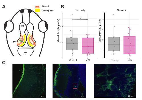 Figure 5—figure supplement 1. Exposure to VPA results in significantly less WFA staining intensity in comparison to control animals.(A) Schematic representation of the tadpole nervous system showing hindbrain (HB), optic tectum (OT) and olfactory bulb (OB). Optic tectum consists of a well-defined layer of cell bodies (yellow) extending their dendrites to the neuropil layer (orange). A representative neuron is shown in green with its cell body located in the cell body layer and dendrites extending in the neuropil layer. (B) The mean intensity of WFA was significantly less in the cell body layer of VPA-exposed animals compared to control. The mean WFA intensity in the neuropil layer was not significantly different across groups. (C) Representative images showing WFA distribution in tectal sections. Green color represents F-WFA while the blue color is DAPI. (Left) F-WFA staining is diffused across cell body and neuropil layers. (Middle) In some tectal sections, distinct compact PNNs (magnified PNN shown in right image) are observed in the tectal cell body layer while neuropil has diffused F-WFA staining. (Right) Magnified image of PNNs from tectal cell body layer. * p < 0.05. Figure 5—figure supplement 1—source data 1. WFA staining data. |