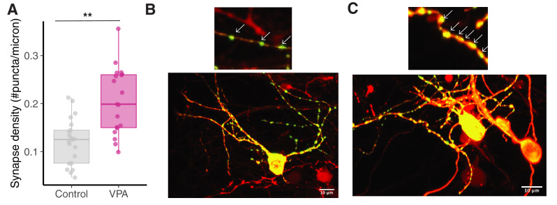 Figure 2—figure supplement 1. Exposure to VPA results in increased synapse density.(A) Box plot showing synapse density for control and VPA groups. VPA exposed tadpoles showed increased synapse density compared to control group. (B) Representative image from control animal expressing punctate PSD95-GFP (green) and pcDNA-mCherry (red). Upper image shows a magnified dendritic branch. (C) Representative image from VPA-exposed animal expressing punctate PSD95-GFP (green) and pcDNA-mCherry (red). Upper image shows a magnified dendritic branch with increased synapse density., ** p < 0.005. Figure 2—figure supplement 1—source data 1. PSD95 overexression source data. |