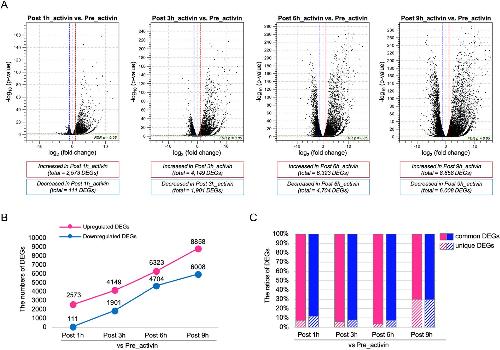 Figure 2. Differentially expressed genes (DEGs) between Pre_activin and each Post_activin sample. DEGs were identified in the comparison of gene expression between Pre_activin and each Post_activin sample based on log2 FC ≥ 2 or ≤ − 2 with FDR at p < 0.05. (A) Volcano plots representing DEGs in each comparison. Each dot represents individual DEG. Dotted vertical lines, log2 FC ≥ 2 or ≤ − 2; dotted horizontal line, the significance cut-off (p < 0.05). (B) Line graph showing the total number of upregulated and downregulated DEGs in each comparison. (C) Bar chart showing the ratio of common DEGs among different Post_activin samples and that of unique DEGs in each Post_activin sample. Common DEGs and unique DEGs are represented by solid or stripe pattern fill, respectively. (B,C) Magenta, upregulated DEGs; blue, downregulated DEGs. |