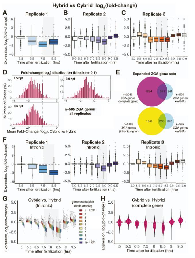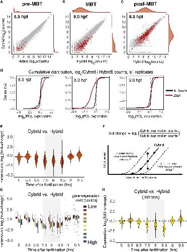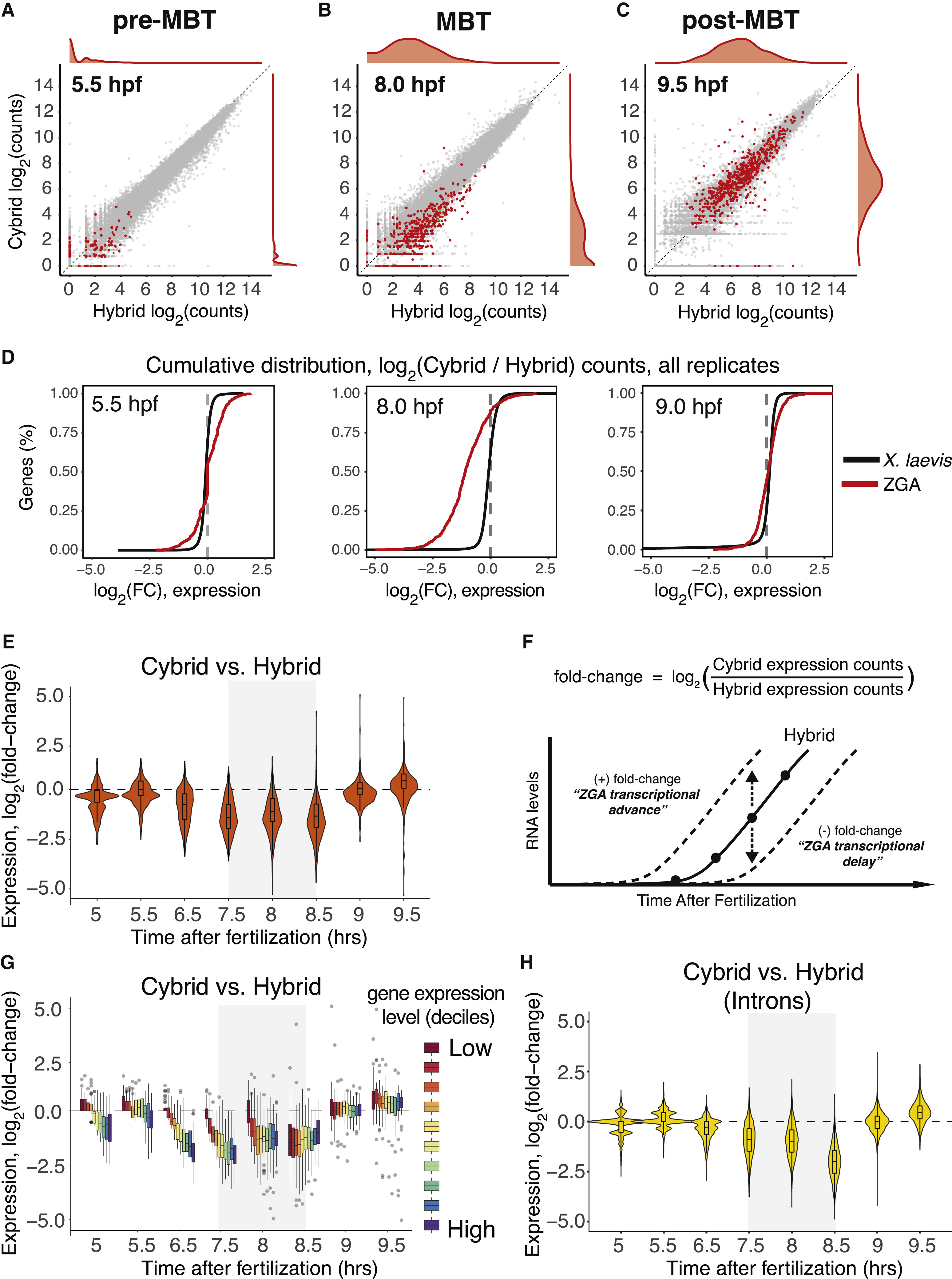 Figure 3. Embryos with less DNA have less zygotic gene expression specifically at the MBT (A) Scatterplot of expression values for all genes before the MBT at 5.5 hpf. In (A)â(C): 595 ZGA genes (red); all other genes (gray); ZGA gene density shown on right and top; X- and Y-axes show log2(counts) of spike-in normalized RNA-seq gene counts. (B) Hybrid versus cybrid gene expression values at the MBT, at 8.0 hpf. (C) Hybrid versus cybrid gene expression values after the MBT, at 9.5 hpf. (D) Cumulative distribution of log2(cybrid â hybrid) fold change values of each ZGA geneâs expression, before the MBT (5.5 hpf), at the MBT (8.0 hpf), and after the MBT (9.0 hpf). Negative values are consistent with delayed expression in cybrids relative to hybrids. Red line is defined X. tropicalis ZGA genes only; black line is X. laevis genes (two-sided Kolmogorov-Smirnov test: D = 0.32 [5.5 hpf]; D = 0.69 [8.0 hpf]; D = 0.22 [9.5 hpf]; p < 10â10 for all; N = 595). (E) Violin plot of fold changes for each ZGA geneâs expression in cybrid relative to hybrid embryos. Box inside shows mean 1st and 3rd quartiles. Hybrid embryos are the reference, so a decreased fold change indicates decreased expression in cybrids. Fold changes are population means of every ZGA geneâs log2-normalized fold change mean from 2 or 3 replicates (N = 595). (F) Schematic of fold change approach to compare transcriptomic time series data. (G) Distribution of log2-normalized fold changes of each ZGA geneâs expression in cybrid versus hybrid embryos, with genes binned according to expression level deciles. Expression level is per gene mean across all time points. Highest expression decile in purple, lowest in dark red (N = 595). (H) Violin plot of fold changes for each ZGA geneâs expression in cybrid relative to hybrid embryos using only the intron signal. Graph parameters identical to (E) (N = 1,899). |