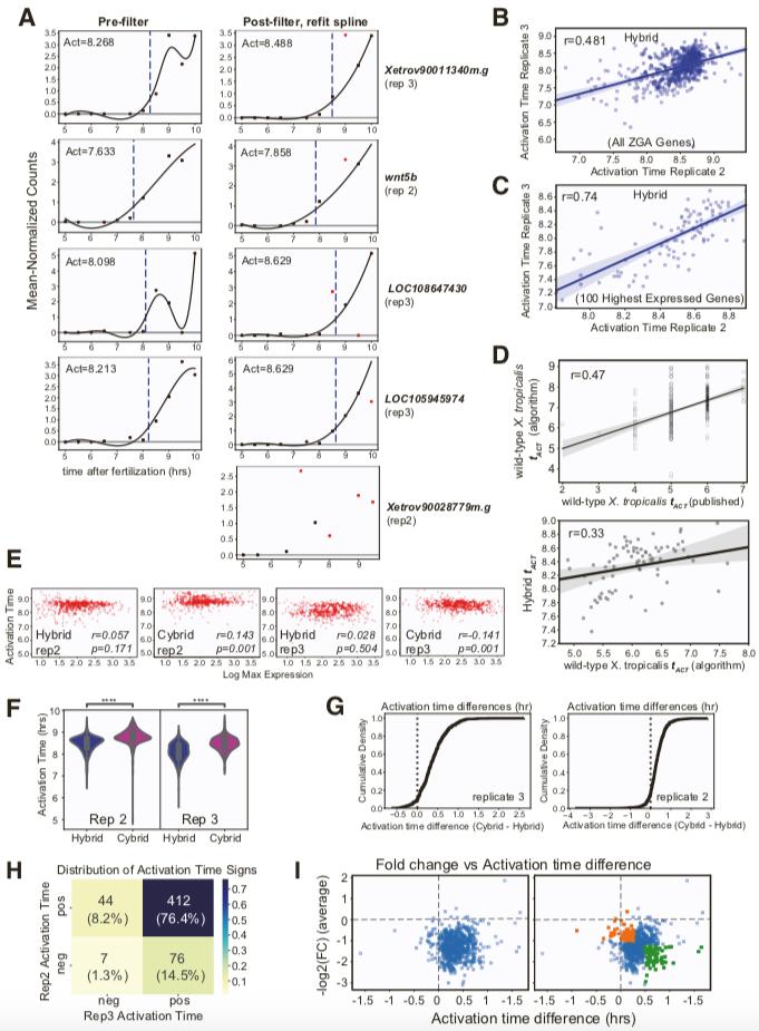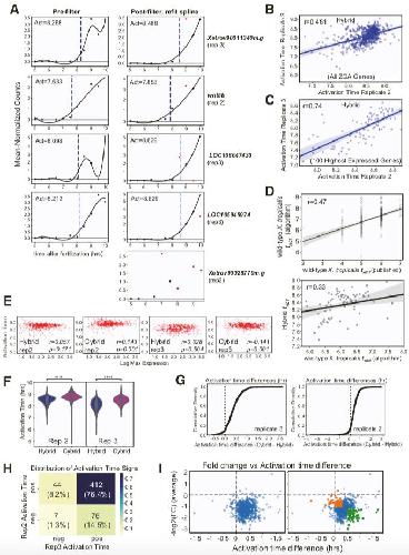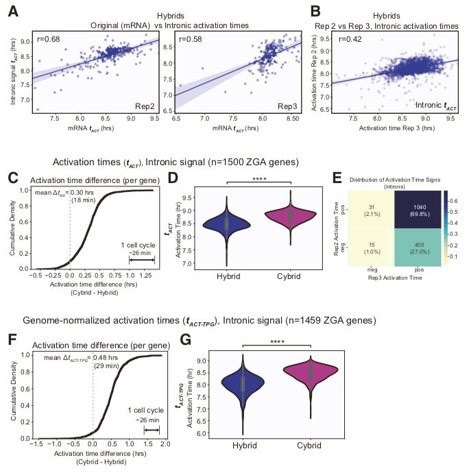Figure S6. Decreased DNA per cell leads to delayed zygotic gene activation for intron- derived and genome-normalized expression. Related to Figure 4 and Figure 5. (A) (Left panel) Scatterplot of activation times for intron-derived ZGA genes compared to mRNA-derived ZGA genes in replicate 2 hybrids, for genes found in both sets (N=238). (Right panel) Scatterplot of activation times for intron-derived ZGA genes compared to mRNA-derived ZGA genes in replicate 3, for genes found in both sets (N=185). In panels (A- B), the blue line is a linear fit and variation (light blue) is the bootstrapped-inferred 95% confidence interval. Pearson correlation in upper left inset. (B) Scatterplot of activation times for intron-derived ZGA genes comparing replicate 2 hybrids to replicate 3 hybrids (N=1564). (C) Cumulative distribution of the activation time difference (hrs) between cybrids and hybrids, for intron-derived high confidence X. tropicalis ZGA genes (N=1500). Dashed black line indicates X=0 (no difference). (D) Violin plot showing mean activation times for each gene over two replicates in hybrid and cybrid embryos for intron-derived ZGA genes. Box plot in center shows median, 1st and 3rd quartiles. **** indicates p-value << 10-10 (paired sample t-test w/Bonferroni correction) (N=1500). (E) Display of the distribution of the sign of âtAct across both replicates for intron-derived ZGA genes. A positive sign indicates that cybrid gene expression was less than that of hybrids (i.e., delayed). Percent of ZGA genes indicated by color as shown in legend (N=1491/1500 genes with a non-zero âtAct ). (F) Cumulative distribution of the genome-normalized activation time difference (hrs), âtAct- TPG, between cybrids and hybrids for intron-derived ZGA genes (N=1459). (G) Violin plot showing mean activation times for each gene over two replicates in hybrid and cybrid embryos for intron-derived ZGA genes. Box plot in center shows median, 1st and 3rd quartiles. **** indicates p-value << 10-10 (paired sample t-test w/Bonferroni correction) (N=1459). |
