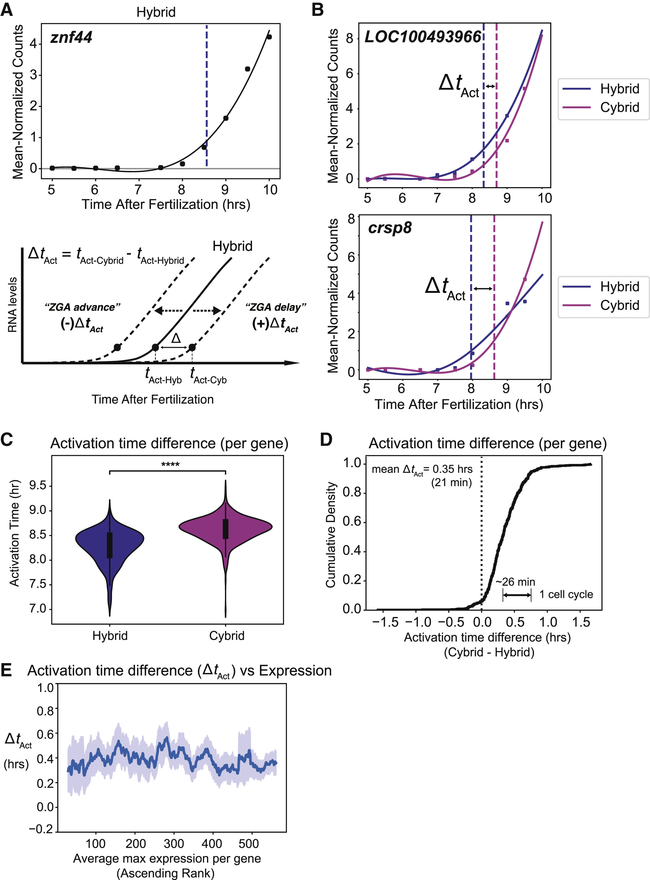Figure 4. Decreased DNA per cell leads to delayed ZGA gene activation (A) Smoothing spline fit (black line) of hybrid embryo RNA-seq time series for example ZGA gene. Black dots denote mean-normalized expression values at each time point. Blue dashed line denotes the estimated âactivation point.â One replicate is shown as representative. Schematic below displays activation time approach to compare transcriptomic time series data. (B) Curve fit and estimated activation times for example ZGA genes in hybrid and cybrid embryos. Time difference between dashed lines (cybrid â hybrid) = activation time difference or ÎtAct. One replicate is shown as representative. (C) Violin plot of mean activation time for each gene over two replicates in hybrids and cybrids. Boxplot in center shows median and 1st and 3rd quartiles. ââââp << 10â10 (paired sample t test w/Bonferroni correction; N = 547). (D) Cumulative distribution of the activation time difference (h) between cybrids and hybrids (N = 547). (E) Relationship between ÎAct and maximum expression for each gene. Values were binned and smoothed over a 30-min sliding window. Light blue is standard error. Replicate 3 is shown as representative. |