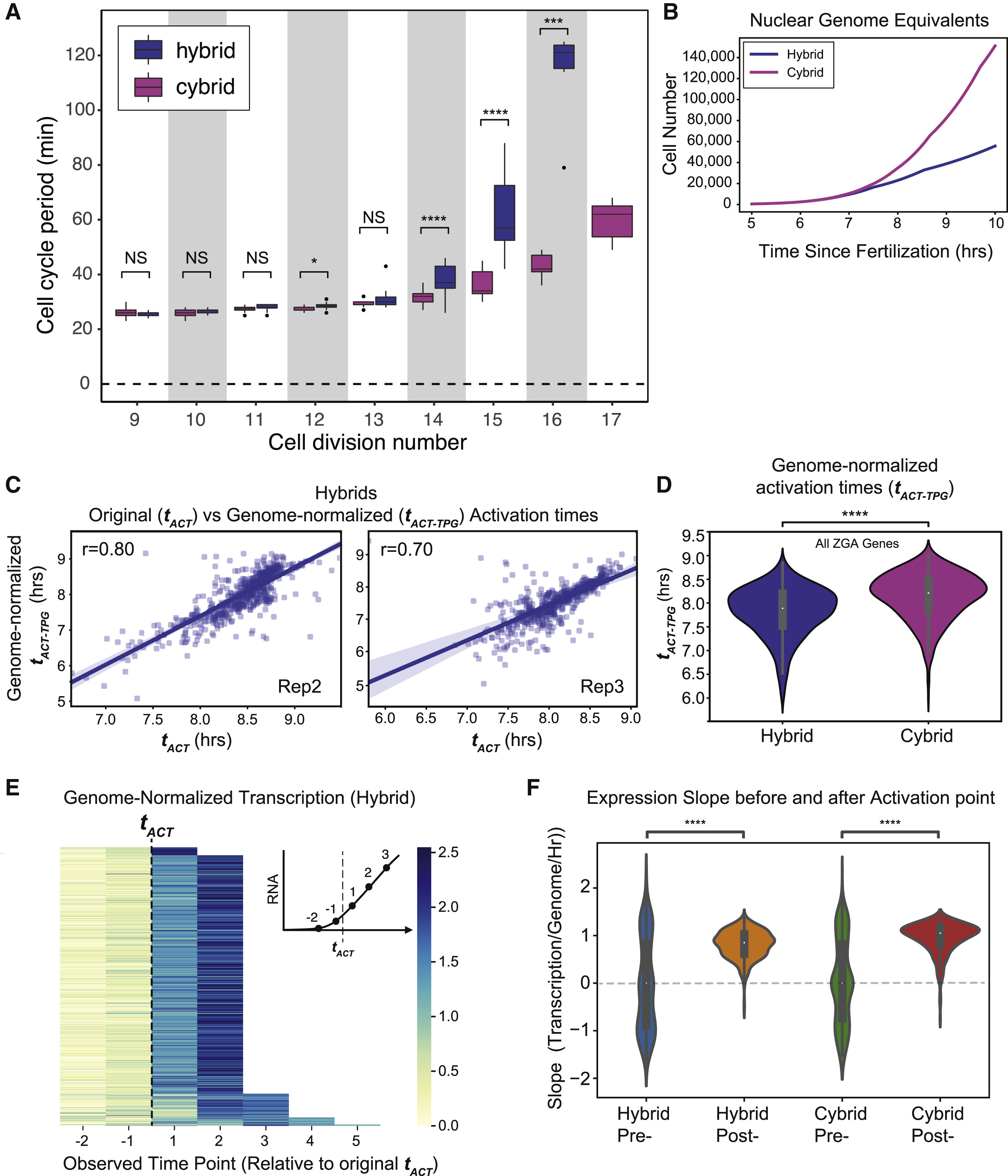 Figure 5. DNA content regulates cell-cycle duration and transcription per genome accelerates through the MBT (A) Cybrid embryos display early cell cycle lengthening as compared to hybrid embryos. Boxplot shows mean inter-cleavage periods for single cells during embryogenesis. Values are taken from movie (see STAR Methods). Box edges are 25th and 75th percentiles; centerline is median. Whiskers include all non-outlier points; dots are outliers. NS, not significant or p > 0.01 between hybrids and cybrids; âp = 0.0012 for this sample; âââp < 0.001; ââââp < 0.0001 between hybrids and cybrids in the same cell cycle (two-tailed t test with unequal variance). (B) Line plot showing estimated genome copy number for hybrids and cybrids. Data are calculated and extended from inter-cleavage division times in (A). Cybrid embryos contain more cells post-MBT due to having 1 to 2 additional rapid cleavage divisions. (C) Scatterplot comparing activation time, tAct, and genome template number normalized activation time, tAct-TPG, for each ZGA gene. Pearson correlation, r = 0.80 (replicate 2; N = 570) and r = 0.70 (replicate 3; N = 538). tAct-TPG values were calculated from the genome-normalized time series using the smoothing spline fit approach as in Figure 4 (see STAR Methods). Regression fit variation (light blue) is the bootstrap-inferred 95% confidence interval. (D) Comparison of genome-normalized activation times (tAct-TPG) between hybrids and cybrids. Replicate mean is for all genes shown. ââââp < 0.0001 (paired sample t test w/Bonferroni correction; N = 520). (E) Heatmap showing genome-normalized expression values for each gene, aligned at time points adjacent to the original activation time, tAct. Legend shows mean-normalized expression values. Inset schematic shows the position of numbered time points relative to tAct. (F) Violin plot showing slope of the genome-template normalized gene expression curves for time points before and after tAct. Note the mean slope changes from â¼0 to â¼1 mean-normalized transcripts per genome per hour, indicating an expression increase above that predicted from genome template number alone. |