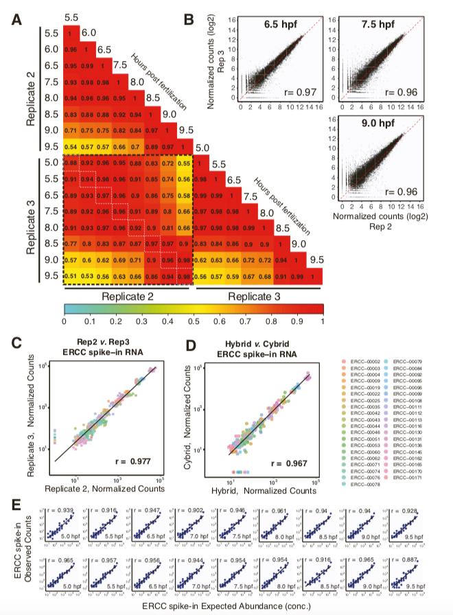 Figure S1. RNA-seq time series, replicate, and exogenous spike-in RNA quality assessment. Related to Figure 1 and Figure 2. (A) Correlation matrix for replicates 2 and 3 at similar time points in hybrids. Pearson correlation for gene expression values is shown in each box. Color corresponds to Pearson correlation value as indicated in the legend below. To reduce zero-inflated correlation effects, we only considered a gene if it had >40 counts total across the time series in both replicates (mean expression >2.5 counts per time point). White dashed boxes correspond to most highly similar time points between replicates. (B) Scatterplot of gene expression values for all genes in hybrids for 2 replicates indicates high reproducibility. Time points shown include 6.5 hours post fertilization (hpf), 7.5 hpf, and 9.0 hpf. X- and Y-axes show log2(counts) of spike-in normalized RNA-seq gene counts. Dashed diagonal line is X=Y. Pearson correlation shown in inset of each plot. (C) Scatterplot of ERCC (External RNA Controls Consortium) spike-in RNA from two hybrid replicates at all time points shows high reproducibility for each of 38 unique spike-in RNA species used during normalization, as well as the spike-in population. Spike-in RNAs were used to normalize expression counts from all time points and conditions within each replicate (see STAR methods). Each color represents a spike-in RNA species, and each RNA includes the 8 high-quality time points found in both replicates. Black line denotes the linear fit to the data. X- and Y-axes show spike-in normalized RNA-seq counts. ERCC RNAs along the Y-axis (7/38) had low expression in one time point in one replicate that had lower sequencing read depth. Pearson correlation shown in lower right corner (r = 0.977). (D) Scatterplot of ERCC spike-in RNA from the hybrid (high ploidy) and cybrid (low ploidy) conditions reveals consistent expression in both conditions at all time points. Hybrid and Cybrid data are from matched samples from a single egg clutch. Each of 38 unique spike-in RNAs are represented by a single color. Black line denotes the linear fit to the data. Pearson correlation shown in lower right corner (r = 0.97). (E) Scatterplot of observed spike-in RNA counts and their expected abundance based on their known concentrations upon addition to samples. High correlations are present for all time points in both hybrids and cybrids shown for one replicate. Similar correlations were found for the second replicate (data not shown). Each blue dot represents one unique spike- in species. Black line denotes the linear fit to the data. Pearson correlation shown in upper left of each plot. |