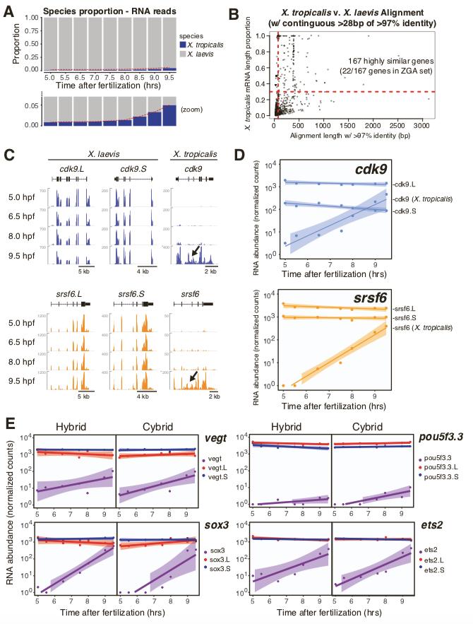 Figure S2. Interspecies alignment quality assessment in hybrids. Related to Figure 2. (A) Bar plot showing proportion of read counts for X. laevis and X. tropicalis across time points. Color indicates species as in legend. (B) Scatter plot showing results of cross-species BLAST between the X. laevis and X. tropicalis transcriptomes (mRNA sequences). There were ~2400 interspecies gene pairs with at least one contiguous nucleotide stretch of >97% identity; each point is one gene pair; genes within a pair are not mutually exclusive, e.g., one X. laevis gene could be the top BLAST hit for multiple independent X. laevis genes. X-axis shows the length of contiguous nucleotides with >97% identity. Y-axis shows the proportion of each X. tropicalis mRNA covered by the contiguous nt region. The red lines indicate thresholds of 0.3 (Y-axis) and 75 nt (X-axis). All genes (n=22) with at least one stretch of 75 nt with >97% interspecies identity with a length over 30% of the total mRNA were not included in the final ZGA gene set (upper right portion of plot). (C) Genome browser images showing gene expression signal (spike-in normalized read counts) for X. laevis and X. tropicalis transcripts for cdk9 and srsf6. Signal tracks include merged data from replicates 2 and 3. Read count shown in Y-axis. Signal intensity was originally at base-pair resolution (unbinned) with mean signal over windows shown for clarity. Transcript structure at top in black (boxes = exons; line = introns). Note the lack of intronic signal in maternal X. laevis genes that are likely mature, spliced transcripts, and the presence of intronic signal in zygotic X. tropicalis genes (black arrow) that likely reflects nascent transcription. cdk9 (top) and srsf6 (bottom) shown as representative MZT genes. (D) Expression time-course profiles for cdk9 and srsf6, which have both maternal (X. laevis) and zygotic (X. tropicalis) mRNA expression in hybrids. The X. laevis genome had undergone a duplication and subsequent divergence that results in two subgenomes, short (S) and long (L). The subgenomes include paralogous transcripts for most mRNAs that have high, but not identical, sequence homology. The lack of cross-alignment in the earlier time points indicates that each RNA species (X. laevis L, X. laevis S, and X. tropicalis) can be distinguished. Gene expression was normalized using spike-ins. Points are overlaid with a lowess fit and the associated standard error of the fit. (E) Expression time-course profiles for maternal transcription factors critical for ZGA in XenopusS1. Vegt, sox3, pou5f3.3, and ets2 have both maternal (X. laevis) and zygotic (X. tropicalis) mRNA expression in hybrids. As in panel C, the lack of cross-alignment in the earlier time points indicates that sequencing reads arising from each species can be distinguished. Gene expression was normalized using spike-ins. Points are overlaid with a lowess fit and the associated standard error of the fit. |