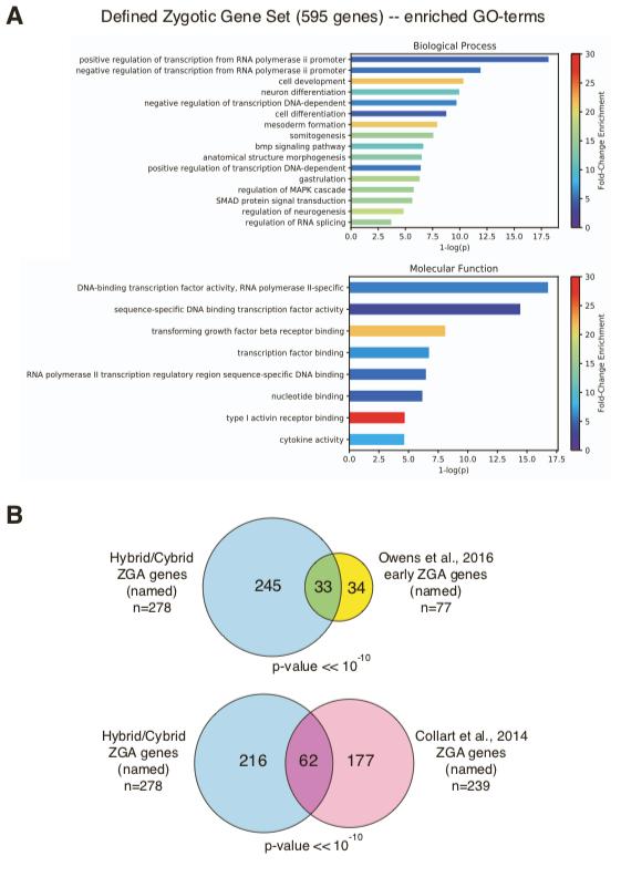 Figure S3. Validation of defined zygotically active genes in hybrids. Related to Figure 2. (A) Gene Ontology (GO) term enrichment of the defined ZGA genes compared to the entire transcriptome. X-axis is -log(p-value), where the p-value was calculated using a hypergeometric test. Fold enrichment of each GO-term in ZGA genes vs. the transcriptome is represented by color as displayed in the legend at right. (B) Venn diagram shows overlap between our hybrid X. tropicalis ZGA gene set and wild- type X. tropicalis ZGA genes defined in published data sets. Only genes annotated with common names were used to directly compare genes from different genome assemblies and annotations, v7 S2,S3 and v9 (this work). |