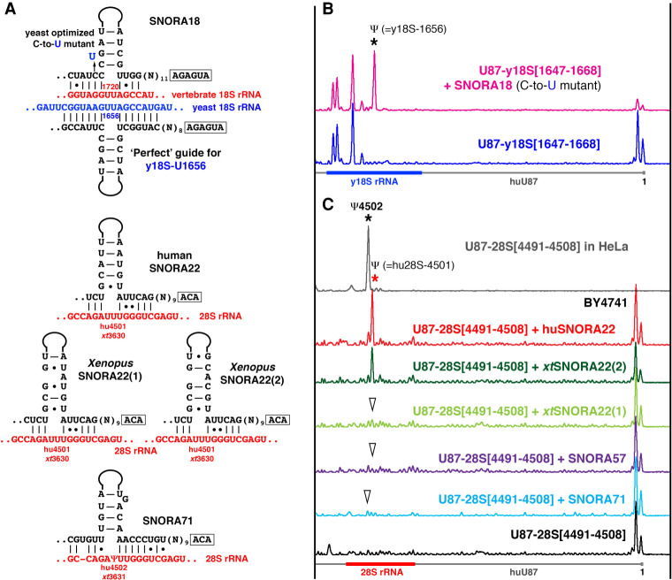 FIGURE 2. (A) Predicted base-pairing of SNORA18, SNORA22, and SNORA71 with 18S rRNAs at position 1720 and with 28S rRNA at positions 4501 and 4502, respectively. (B,C) Pseudouridylation of artificial substrate RNAs in yeast cells. (B) Yeast optimized SNORA18 (C-to-U-mutant) can induce predicted pseudouridylation in a fragment of yeast 18S rRNA [1647–1668 nt] inserted in U87 RNA (pink trace, star). Expression of the artificial substrate RNA U87-y18S[1647–1668] alone used as a negative control (blue trace). (C) When expressed in yeast cells, human SNORA22 (red trace, red star) and Xenopus SNORA22(2) (dark green trace) can induce pseudouridylation of position 4501 in a 28S rRNA fragment [4491–4508 nt] inserted in U87 RNA. Xenopus SNORA22(1) (light green trace, arrowhead) and SNORA57 (dark blue trace, arrowhead) do not show modification activity on the same substrate RNA. SNORA57 activity on 28S-4501 was predicted by Kehr et al. (2014); for the proposed base-pairing see Supplemental Figure S1. Note that two copies of Xenopus SNORA22—functional and nonfunctional—differ only in their upper stem structures. In human, 28S rRNA position 4502 is pseudouridylated, and this position becomes modified in the artificial substrate RNA expressed in HeLa cells (top gray trace, black star). SNORA71 can base-pair with 28S rRNA at position 4502 (A). However, when it was tested in yeast, SNORA71 could not induce this modification in the artificial substrate RNA (light blue trace, arrowhead).