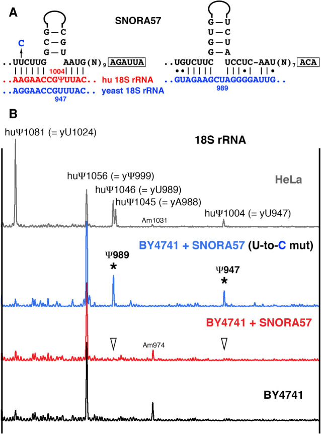 FIGURE 4. SNORA57 guide activities on yeast 18S rRNA. (A) Postulated base-pairing of SNORA57 with human (red) and yeast (blue) 18S rRNA; the 5′ terminal pseudouridylation pocket is shown on the left and the 3′-terminal pseudouridylation pocket on the right. To make a yeast optimized version of SNORA57 an indicated U-to-C mutation was introduced in the ASE of the 5′ terminal pseudouridylation pocket. (B) Mapping pseudouridines in human 18S [968–1086 nt] (HeLa, top gray trace) and the equivalent region of yeast 18S rRNA (BY4741, black, red, and blue traces). Normally, yeast 18S rRNA has only Ψ999 in this region (black trace). Expression of vertebrate SNORA57 did not change the modification pattern of yeast 18S rRNA (red trace, arrowheads indicate predicted target positions for SNORA57). Yeast optimized SNORA57 with the U-to-C mutation could induce pseudouridylation of yeast 18S rRNA at two positions, 947 and 989 (blue trace, stars).