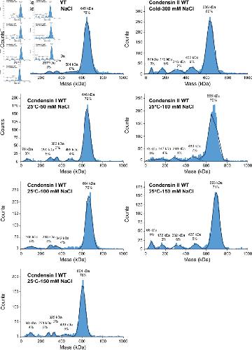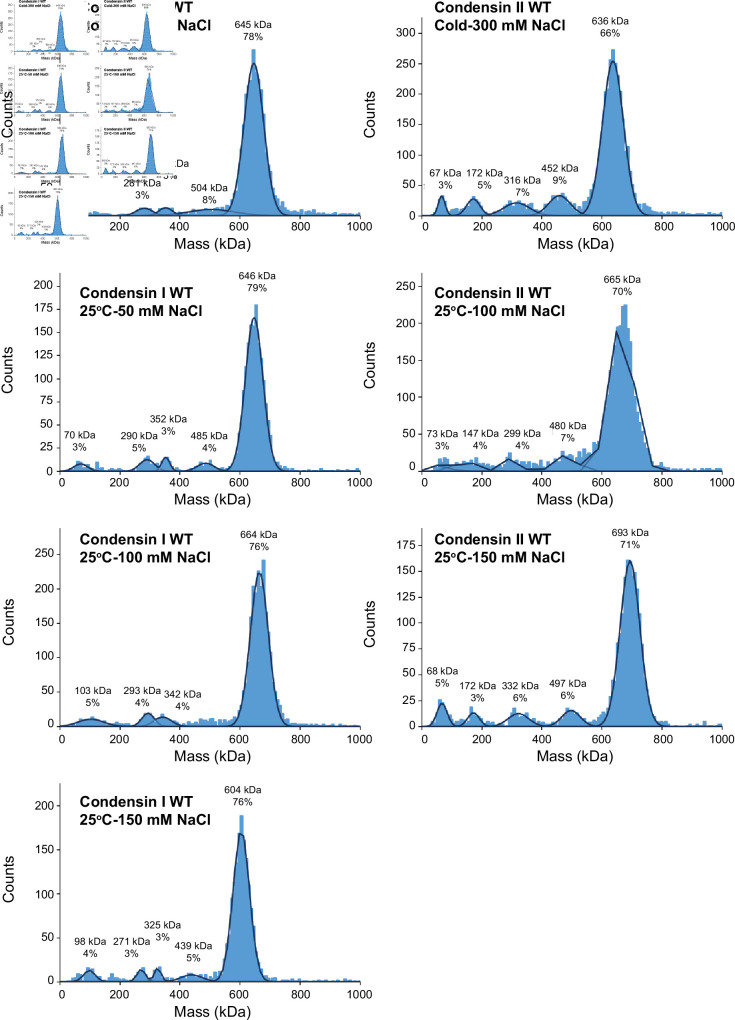 Figure 2—figure supplement 1. Mass photometry of condensin complexes.Recombinant condensin complexes were diluted to 50 nM in buffer (10 mM HEPES pH 8, 2.5 mM MgCl2, 1 mM DTT, 5 mM ATP) supplemented with the indicated sodium chloride concentration and the indicated temperatures for 30 min subjected to mass photometry to determine whether the complexes remain intact in the buffer conditions used for the binding assays. Histograms of the particle count at the indicated molecular mass. The molecular mass was calibrated using bovine serum albumin and urease. The black lines are the Gaussian fits to the peaks. The peak of the Gaussian fit and the percentage of particles in the peak are indicated above each peak. Theoretical molecular weights of condensin I and condensin II complexes are 638 kDa and 658 kDa, respectively. |