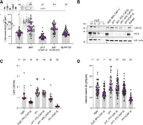 Figure 3. Chromosome elongation by H1.8 depletion is due to enhanced condensin I loading on chromatin.(A) Schematic of extract dilution to disperse individualized chromosomes. (B) Western blots of total egg extracts showing depletions of indicated proteins. (C) Representative images of mitotic chromosomes after dilution of indicated extracts. Bar, 10 μm. (D) Quantification of the chromosome length. Data distribution of the length of individual chromosomes from three independent experiments (green, purple, gray) is shown. Each black dot represents the median length of chromosomes from a single experiment. Bar represents mean and SEM of three independent experiments. (E) Quantification of CAP-G levels normalized to DNA signal (Cy3-dUTP) in the indicated conditions by immunofluorescence. Each dot represents the mean of CAP-G intensity normalized to DNA intensity of a single chromosome cluster (from one nucleus). The data plotted is median ± 95% CI. (F) Chromosome lengths in the indicated condition. Each dot represents length of a single chromosome. Bars represent median ± 95% CI. The p-values in (D) compare the median chromosome lengths in each condition and were calculated using an unpaired Studentâs t-test, and those in (E, F) compare the median values in a single experiment and were calculated using a two-tailed MannâWhitney U-test. The number of nuclei (E) or chromosomes (D, F) imaged in each condition for each experiment is indicated above the figure. Figure 3âsource data 1. Source data for all the figures in Figure 3 and its figure supplements.Figure 3âfigure supplement 1. Condensin I loading determines chromosome length.(A) Length of mitotic chromosomes in the indicated conditions after extract dilution showing no effect of CAP-D3 (condensin II) depletion in both mock and H1.8 depletion background. Each dot represents length of a single chromosome. Bars represent median ± 95% CI. The length of >50 chromosomes was measured in each condition for every experiment. (B) Total egg extract blots showing the partial depletions of condensin in the indicated conditions. The p-value in (A) was calculated by a two-tailed MannâWhitney U-test. The number of chromosomes imaged in each condition for each experiment in (A) is indicated above the figure (Figure 3âsource data 1). (C, D) Biological replicate of the partial condensin I depletion experiment in Figure 3E and F. |