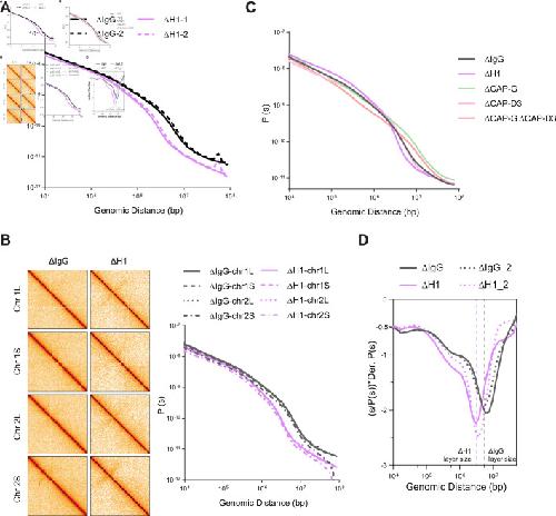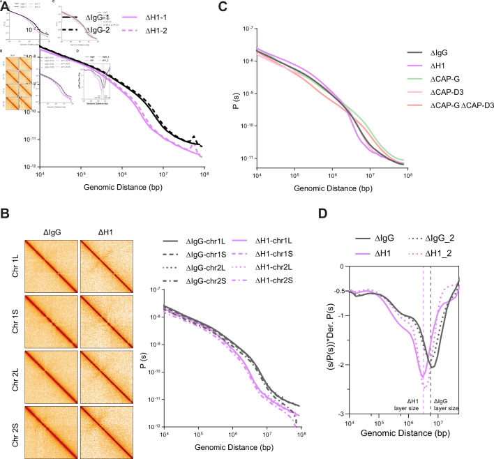 Figure 4. Effects of H1 and/or condensin I and II depletion on mitotic genome folding.(A) Hi-C maps of metaphase X. laevis chromosome 3S, binned to 250 kb, in the indicated condition. (B) Genome-wide average contact probability decay curves for the indicated conditions showing the changes in longer distance interactions. (C) Derivative plots of the average contact probability decay curves for dispersed chromosomes from mock (ΔIgG) and H1.8-depleted extracts (ΔH1) showing the change in estimated loop size. The solid and dotted lines are from two independent biological replicates. (D) Derivative plots of the genome-wide average contact probability decay curves in the indicated conditions. The dotted lines indicate the layer sizes for each plotted condition. (E) Estimates of layer size from derivatives of genome-wide probability decay curves upon depletion of H1.8 and CAP-G (condensin I) or CAP-D3 (condensin II). The mean and range of two biological replicates are shown. Figure 4—source data 1. Source data for all the figures in Figure 4 and its figure supplements.Figure 4—figure supplement 1. Effects of H1, condensin I, and condensin II depletion on mitotic genome folding.(A) Contact probability decay curves of mitotic chromosomes in mock (ΔIgG) and H1-depleted (ΔH1) extracts from two different experiments showing the replicability of the Hi-C features. The solid and dashed lines are from biological replicates. (B) Hi-C maps (left) binned to 500 kb and contact probability curves (right) of single chromosomes showing the uniform effects of H1.8 depletion genome wide. (C) Genome average contact probability decay curves upon H1.8, CAP-G, and CAP-D3 depletions. (D) Genome average contact probability derivative curves of metaphase chromosomes in undiluted mock (ΔIgG) and H1.8-depleted (ΔH1) extracts. The layer size estimates from the valley in the derivative plots are indicated. The dotted lines are a biological replicate. The data for this figure is submitted as Figure 4—source data 1. |