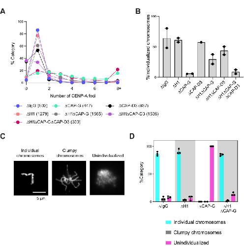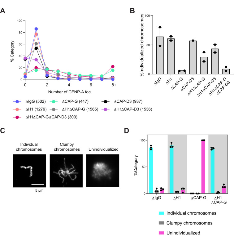 Figure 6—figure supplement 1. Additional data for chromosome clustering.(A) Distribution of CENP-A foci per DNA mass in the experiment shown in Figure 6A–C. Clusters of unresolved chromosomes are represented by higher numbers (>3) of CENP-A foci per DNA mass indicates clusters. No detectable CENP-A focus in ∆CAP-D3 (∆condensin II) extracts is due to low CENP-A signal, reflecting the reported role of condensin II in CENP-A loading (Bernad et al., 2011). The number noted in each sample label is the number of chromosomes/clusters counted in each condition. (B) Percent frequency of single chromosomes (chromosomes in DNA masses with <2 CENP-A foci) in the indicated conditions showing that the cutoff for number of CENP-A foci does not change the relative individualization measured. The number of DNA masses imaged in each condition is the same as in Figure 6C. (C) Categories of chromosome clusters observed upon performing chromosome individualization assay. (D) Percent frequency of DNA clusters categorized as unindividualized nuclei as in (C) in the indicated conditions. Each chromosome mass is classified to one of the three categories based on the morphology. ‘Clumpy chromosomes’ represents a mass containing a few clearly recognizable chromosomes, while ‘unindividualized’ represents a mass with unresolved multiple chromosomes. Mean and SEM from three independent experiments. Each dot represents the percentage of unindividualized chromosome clusters in the indicated condition in an independent biological replicate. The number of DNA masses counted in each condition is as follows: ΔIgG (50, 128, 201), ΔH1 (66, 135, 447), ΔCAP-G (13, 30, 50), ΔH1ΔCAP-G (58, 201, 194). |