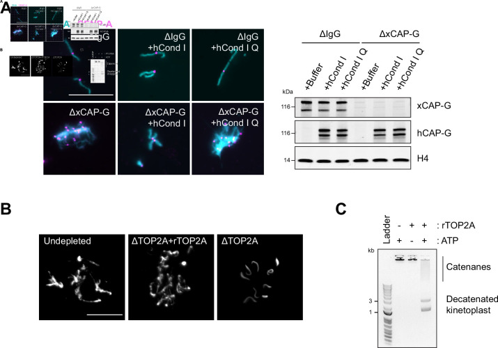 Figure 2âfigure supplement 2. Recombinant human condensin I and X. laevis TOP2A are functional.(A) Representative Hoechst (DNA) and CENP-A immunofluorescence images of chromosomes in indicated metaphase egg extracts after dilution, which disperses individualized chromosomes (left). Extracts depleted of condensin I (ÎCAP-G) were complemented with recombinant human condensin I and condensin I Q-loop mutant protein complexes. Total egg extract western blots of depletion and the rescue conditions (right). (B) Recombinant X. laevis TOP2A is functional in Xenopus egg extracts. Sperm nuclei were added to undepleted, TOP2A-depelted CSF extracts (âTOP2A), or âTOP2A extracts with purified recombinant TOP2A. Representative Hoechst (DNA) images of sperm are shown. In undepleted or âTOP2A extracts with supplemented TOP2A, proper sperm remodeling led to mitotic chromosomes formation. In âTOP2A extracts, sperm remodeling failed and sperm nuclei remained compact crescent-like shape. (C) Recombinant X. laevis TOP2A possesses decatenating activity in vitro. Agarose gel of kinetoplast decatenation assay. Recombinant TOP2A promoted ATP-dependent decatenation of kinetoplast DNA. Bar, 20 µm. |