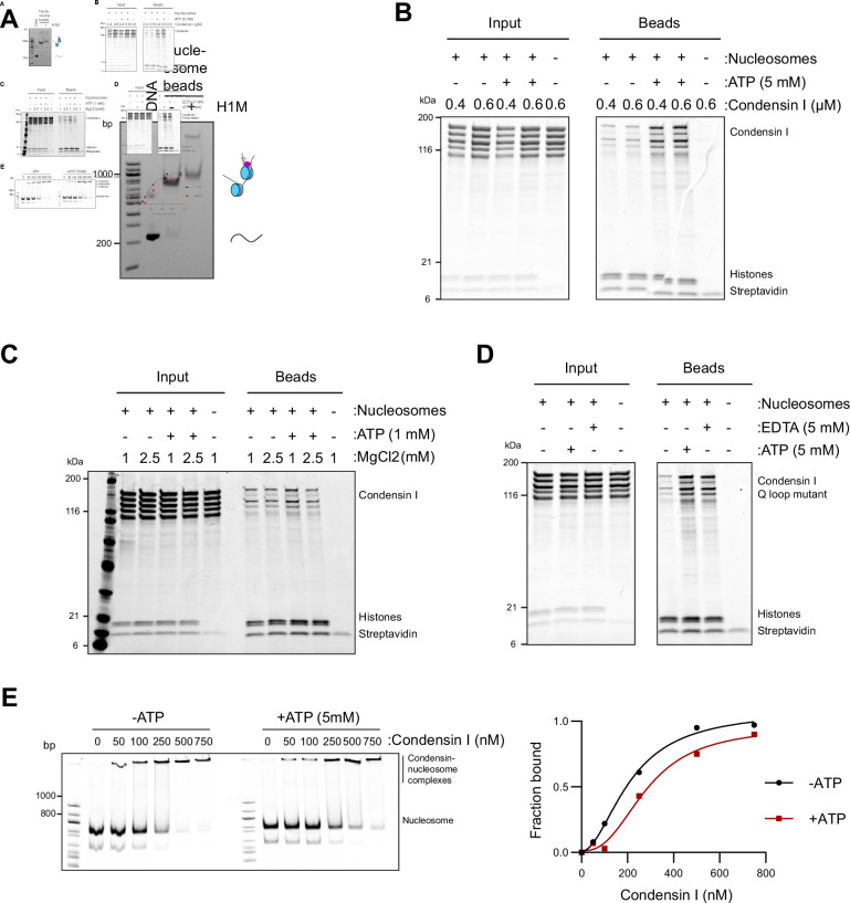 Figure 2—figure supplement 3. Condensin binding is inhibited by magnesium.(A) Native PAGE gel analysis of nucleosome array beads loaded with or without H1.8 after digestion of the array with AvaI, which released monomers of nucleosome positioning sequence. A complete shift of monomer bands by H1.8 addition indicates the saturated occupancy of nucleosome and H1.8. (B) Purified recombinant human condensin I was incubated with nucleosome array beads in buffer containing 2.5 mM MgCl2 with and without 5 mM ATP. Coomassie staining of input and bead fractions is shown. (C) Purified human condensin I was incubated with nucleosome array beads in buffer containing 1 or 2.5 mM MgCl2 with and without 1 mM ATP. Coomassie staining of input and bead fractions is shown. (D) Purified human condensin I Q-loop mutant was incubated with nucleosome array beads in buffer containing 2.5 mM MgCl2 with the addition of 5 mM ATP or 5 mM EDTA. Coomassie staining of input and bead fractions is shown. (E) Alexa647-labeled 196 bp mononucleosomes were incubated with indicated concentrations of condensin I in the presence of 2.5 mM MgCl2 and with or without 5 mM ATP and electrophoresed on a 5% native PAGE (above). Bands at the well represent the nucleosome-condensin complex. Absence of signals at the well in the absence of condensin I indicates that mononucleosomes do not form large aggregates in the tested experimental conditions. Quantification of the condensin-bound fraction of the nucleosomes showing no increase in binding affinity due to ATP (Figure 2—source data 1). |