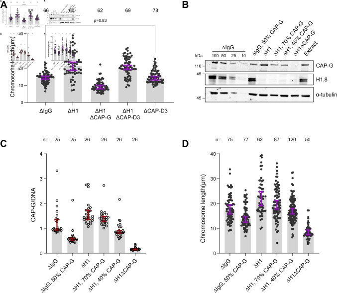 Figure 3—figure supplement 1. Condensin I loading determines chromosome length.(A) Length of mitotic chromosomes in the indicated conditions after extract dilution showing no effect of CAP-D3 (condensin II) depletion in both mock and H1.8 depletion background. Each dot represents length of a single chromosome. Bars represent median ± 95% CI. The length of >50 chromosomes was measured in each condition for every experiment. (B) Total egg extract blots showing the partial depletions of condensin in the indicated conditions. The p-value in (A) was calculated by a two-tailed Mann–Whitney U-test. The number of chromosomes imaged in each condition for each experiment in (A) is indicated above the figure (Figure 3—source data 1). (C, D) Biological replicate of the partial condensin I depletion experiment in Figure 3E and F. |