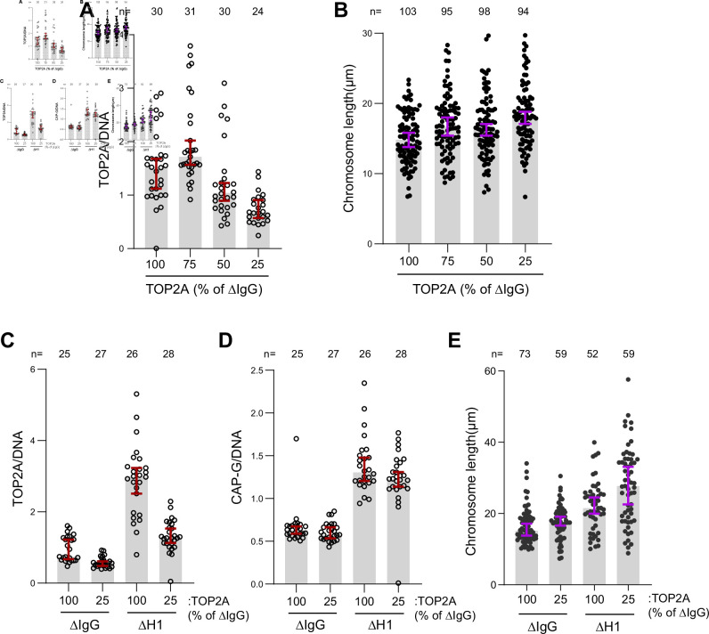 Figure 3âfigure supplement 2. TOP2A overloading is not responsible for chromosome elongation.(A) Sperm nuclei were replicated in undepleted interphase extracts supplemented with 25 nM Cy3-dUTP. The nuclei were then cycled back by mixing with different ratios of ÎTOP2A extracts. Immunofluorescence data showing chromatin-bound TOP2A normalized to Cy3-dUTP signal in each condition. Each dot represents the normalized mean intensity of a single nucleus. (B) Chromosome lengths in the indicated conditions. Each dot represents the length of a single chromosome. (C) Sperm nuclei were replicated in either mock (ÎIgG) and H1.8-depleted (ÎH1) extracts and cycled back using 3 volumes of the corresponding extracts (ÎIgG/ÎH1) or 3 volumes of ÎIgGÎTOP2A/ÎH1ÎTOP2A extracts correspondingly. Immunofluorescence data showing the chromatin-bound TOP2A in the indicated conditions. Each dot represents the normalized mean intensity of a single nucleus. (D) Immunofluorescence data showing chromatin-bound CAP-G (condensin I) and chromosome lengths in the indicated conditions. Each dot represents one nucleus (D) or one chromosome (E). Data plotted for all plots are medians and corresponding 95% CI. The number of nuclei or chromosomes is indicated above the plots. |