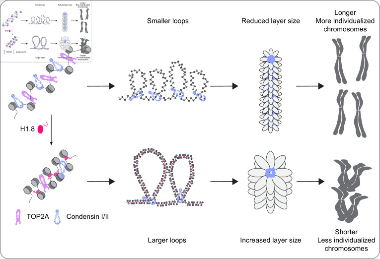 Figure 8. A graphical model of how H1.8 controls mitotic chromosome length.In the absence of H1.8, more condensins and topo II bind to more DNA loops of shorter length, resulting in longer and more individualized chromosomes (top). H1.8 limits chromatin levels of condensins and topo II to generate longer and thus fewer DNA loops, resulting in shorter and less individualized chromosomes (bottom). |