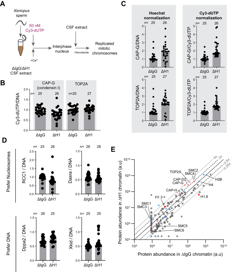 Figure 1—figure supplement 1. H1.8 depletion does not lead to global accumulation of DNA-binding proteins.(A) Experimental scheme to incorporate Cy3-labeled nucleotides to use normalization of immunofluorescence signals on chromosomes. (B) Quantification of Cy3-dUTP signals normalized to Hoechst 33342 signals, showing uniform normalization across two coverslips used for quantification of condensin I and TOP2A. The result also indicates no detectable defect in DNA replication in ∆H1 extracts. (C) CAP-G (condensin I) and TOP2A immunofluorescence signal levels on chromosomes normalized with Hoechst and incorporated Cy3-dUTP. Normalization using Hoechst 33342 and Cy3-dUTP/Cy5-dUTP signals was shown to be consistent across many experiments. (D) Quantification of immunofluorescence signal levels of two proteins that prefer nucleosomes (RCC1 and Dasra A) and two that prefer to bind nucleosome-free DNA (Dppa2 and Xkid) (Zierhut et al., 2014). In (B–D), distribution of signal intensity per chromosome cluster (dots), and median and SEM from one experiment are shown. This analysis was performed twice, and the similar results were obtained. (E) Protein abundance on metaphase sperm chromosomes purified from mock and H1.8-depleted extracts. Subunits from the structural maintenance of chromosomes (SMC) family complexes are labeled in pink. Core histones and their variants are in blue and linker histone variants are shown in red. The lines for 0.25×, 0.5×, 1, 2×, and 4× abundance on ΔH1 compared to ΔIgG chromosomes are shown. The mass spectrometry analysis was performed once. The number of nuclei imaged in each condition for each experiment in (B–D) is indicated above the figure. |