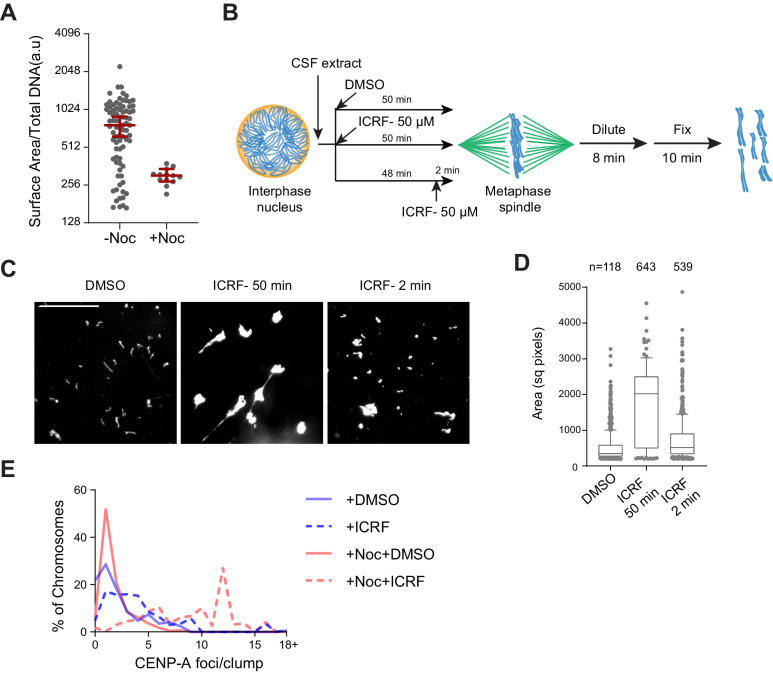 Figure 5. Substantial interchromosomal links remain in metaphase chromosomes.(A) Schematic showing the dispersal protocol and the different stages for the two chromosome individualization measurements. (B) Representative images of metaphase chromosomes in extracts containing Alexa Fluor 647-labeled tubulin (blue) with and without 10 µg/ml nocodazole. DNA was visualized using Hoechst 33342 (magenta). Scale bar is 20 µm. (C) Quantification of the three-dimensional surface area normalized to the total DNA intensity in (B). Each dot represents a single chromosomal mass. The number of masses quantified in each condition is indicated. (D) Representative images of the dispersed chromosomal masses in the indicated conditions. Scale bar is 20 µm. (E) Percent frequency of individualized chromosomes (chromosomes in DNA masses with <4 CENP-A foci) in the indicated conditions. Data from two biological replicates is shown. The number of masses quantified in each condition is indicated. Figure 5âsource data 1. Source data for Figure 5 and its figure supplement.Figure 5âfigure supplement 1. Regulation of chromosome individualization by topo II, condensins, and H1.8 in Xenopus egg extracts.(A) Biological replicate of Figure 5C. (B) Schematic of ICRF-193 addition to check for requirement of topo II activity in individualizing chromosomes. Interphase nuclei were first formed in âIgG or âH1 extracts, topo II inhibitor ICRF-193 (50 µM) was added to egg extracts, either together with corresponding depleted egg extracts and incubated for 50 min (ICRF-50 min), or 48 min after adding the depleted extracts, followed by 2 min incubation with ICRF-193 (ICRF-2 min). (C) Metaphase extracts processed as (A) were diluted to disperse individualized chromosomes. Representative Hoechst images of chromosomes are shown. Bar, 20 µm. (D) Quantification of the Hoechst-stained area of chromosomes in (B). Each dot represents the area of a single chromosome or a chromosome cluster. Large values indicate the extent of chromosome clusters. The box shows the 10thâ90th percentile limits of the sample values. The number of DNA masses imaged in each condition is indicated above the figure. (E) Histogram of the number of chromosomes in clusters containing the indicated number of CENP-A foci in the indicated conditions. The number of chromosomes imaged is the same as in Figure 5E. The data for this figure is submitted as Figure 5âsource data 1. |