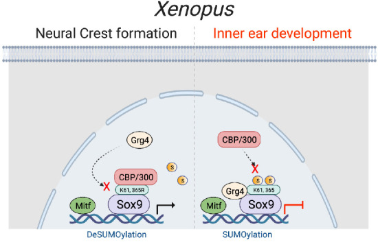 Figure 2. SUMOylation of Sox9 on lysine 61 and 365 (K61, 365) represses transcriptional activity by recruiting repressor Grg4 to form an inhibitory complex, which suppresses neural crest formation but promotes inner ear development in Xenopus.Grg4: Groucho-related gene 4; Sox: SRY-related HMG-box; SUMO: small ubiquitin-like modifier. Created with BioRender.com.