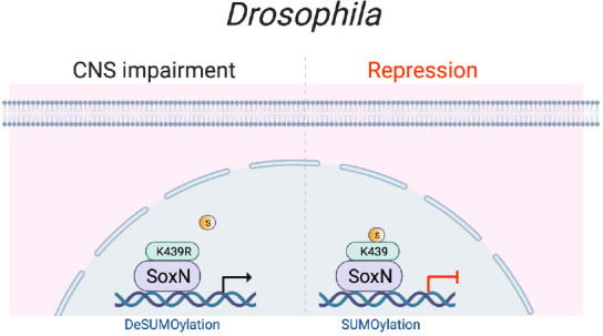 Figure 3. SUMOylation of SoxN on lysine 439 (K439) suppresses transcriptional activity, which prevents CNS from impairment in Drosophila.CNS: Central nervous system; Sox: SRY-related HMG-box; SUMO: small ubiquitin-like modifier. Created with BioRender.com.