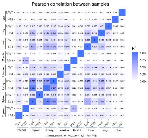 Figure 3. RNA-Seq correlation among the samples. Heat maps of the correlation coefficient between samples are shown. Numbers indicate the square of the Pearson coefficient (R2). The closer the correlation coefficient was to 1, the greater the similarity of the samples. Generally low R2 values indicated a dramatic difference between different tissues and two FV3 strains. |