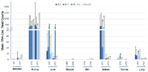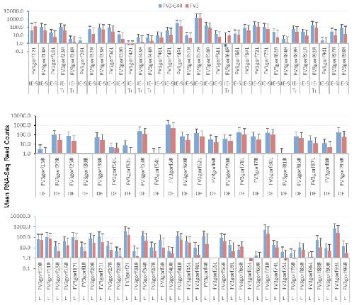 Figure 6. Differential expression of individual genes of FV3 between the FV3-∆64R and FV3-WT infected groups. The genes are categorized based on their sequential classes as immediate early (IE), delayed early (DE), and late (L) viral transcripts. RNA-Seq reads are presented as averages across the eight types of different tissues (i.e., intestine, kidney, liver, muscle, skin, spleen, thymus, and lung) to demonstrate that the differential expression is dependent on the gene and virus strain. Note that the y-axis is in a log10 scale. Other abbreviations: 64, FV3-∆64R; IE-S, immediate early stable messages; IE-Tr, immediate early transient messages; WT, FV3-WT. |