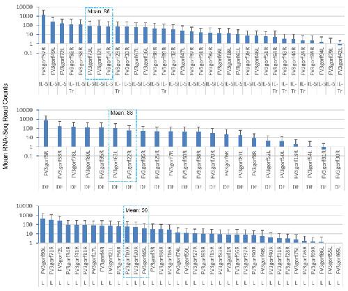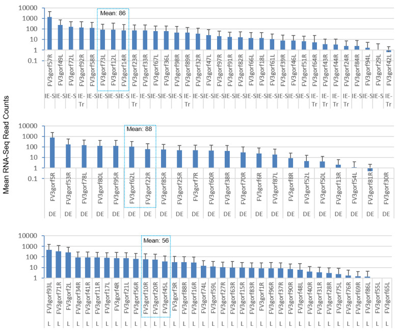 Figure 7. Sorted expression levels of individual FV3 ORF coding genes to show the relative expression order across and within each temporal gene classes. The genes are categorized based on their sequential classes as immediate early (IE), delayed early (DE), and late (L) viral transcripts. RNA-Seq reads are presented as averages across all samples to demonstrate the differential expression based on each gene in general at three days post-infection. Note that the y-axis is in a log10 scale, and is the difference of the mean values between each temporal gene classes. The genes, which have an expression level close to the group means (framed by the blue dashed line), should serve as better gene markers for the estimation of viral genome copies for classical QPCR detection. Other abbreviations: 64, FV3-∆64R; IE-S, immediate early stable messages; IE-Tr, immediate early transient messages; WT, FV3-WT. |