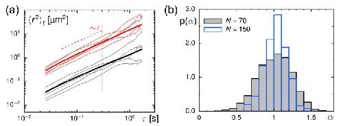 Figure 1. (a) Representative TA-MSDs for trajectories with length N=70 (randomly chosen from the ensemble) from experiments in glycerol–water mixtures (red thin lines) and in Xenopus extract (black thin lines), together with the respective ensemble-averaged TA-MSDs (colored thick lines). For better visibility, data for calibration experiments have been shifted upward tenfold. The scaling for normal diffusion (〈r2(τ)〉t∼τ) is indicated by a red dashed line; vertical grey dashed lines indicate the fit region used to analyze individual TA-MSDs. (b) The PDF of anomaly exponents, p(α), as obtained from fitting TA-MSDs in glycerol–water mixtures features a mean 〈α〉≈1, irrespective of the trajectory length (black-grey histogram: N=70, blue histogram: N=150).