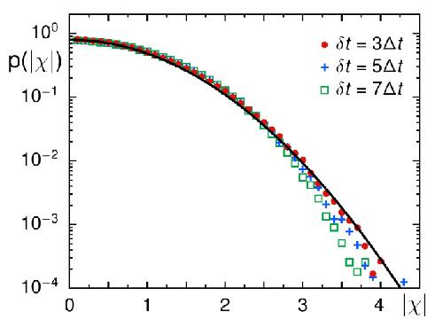 Figure 3. The PDF of normalized increments taken within a period δt, shown here as p(|χ|), complies well with a standard Gaussian (black full line) for different choices of δt (color-coded symbols). For δt≥5Δt and |χ|>3, consistently lower probabilities than the Gaussian benchmark are observed for unknown reasons.