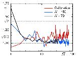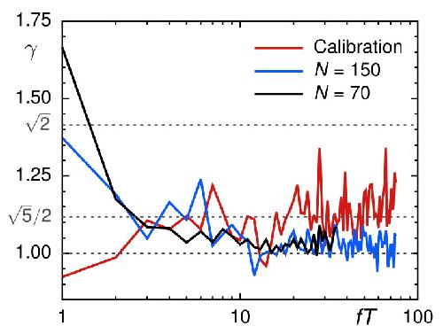 Figure 6. The coefficient of variation of individual PSDs with respect to the ensemble mean, γ(f), for normally diffusive trajectories from calibration experiments (red line) clearly assumes higher values than those for trajectories from the Xenopus extract (blue and black lines), irrespective of the trajectory length, N. As predicted for FBM, these subdiffusive SPT data converge toward γ=1, whereas normally diffusive data from calibration experiments converge to the predicted value γ=5/2. Both are clearly distinct from the prediction for superdiffusive FBM motion, γ=2. For convenience, frequencies f were made dimensionless by multiplication with the total time T=NΔt covered in each trajectory.