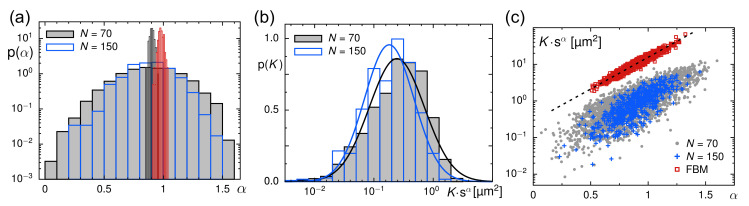 Figure 2. (a) The PDF of anomaly exponents, p(α), as obtained from fitting TA-MSDs in the interval τ∈[0.05,0.3] s, features a mean 〈α〉≈0.9, irrespective of the trajectory length (black-grey histogram: N=70, blue histogram: N=150). The considerable width of the PDF may not only reflect statistical fluctuations but is likely to also report on spatially varying material properties of the Xenopus extract. Performing a bootstrapping approach with geometric averaging (black-open histogram) confirms the slightly subdiffusive motion of particles, while an arithmetic averaging (red histogram) overestimates the mean scaling exponent; see also main text for discussion. Please note the logarithmic y-axis. (b) The PDF of generalized diffusion coefficients, p(K), shown here versus the average area covered in one second, K×1sα, features an almost lognormal shape (indicated by full lines) for trajectory lengths N=70 (grey/black) and N=150 (blue), with a slight tendency for lower mobilities in longer trajectories. Please see the main text for discussion. (c) A scatter plot of trajectory-wise values of α and K (blue and grey symbols) highlights a correlation between these two quantities, in good agreement with results on simulated FBM trajectories with a Hurst coefficient H=α/2=0.45 (red symbols). The black dashed line is an empiric guide for the eye. FBM simulation data have been shifted upward fivefold for better visibility.