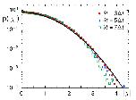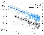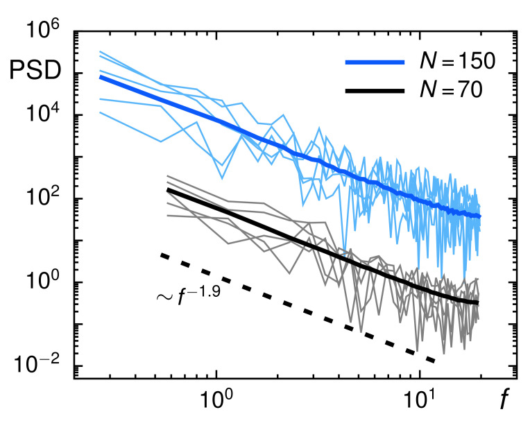 Figure 5. The PSD of individual trajectories (black and blue thin lines, representing trajectories with length N=70 and N=150, respectively) fluctuate around the ensemble-averaged PSD (thick colored lines). In both cases, the FBM prediction for a scaling S(f)∼1/f1+〈α〉 (with 〈α〉=0.9, dashed line) are nicely met. For better visibility, data for N=150 have been shifted upward 100-fold.