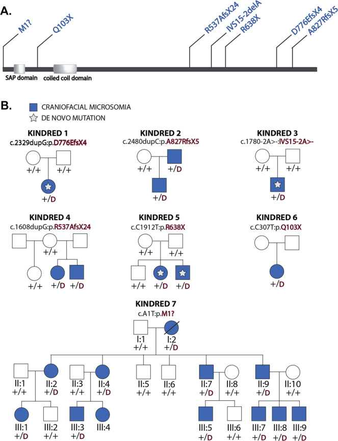 Fig. 1. SF3B2 variants in pedigrees with craniofacial microsomia.A` Domain structure of SF3B2 with variants identified noted above. Domain annotation based on UniProt accession Q13435. B Pedigrees of kindreds with SF3B2 LOF variants. De novo or transmitted LOF variants are indicated above each pedigree, with stars denoting confirmed de novo variants. ‘+’ represents a wild type allele, and ‘D’ represents the LOF variant in SF3B2 indicated above the pedigree. Individuals with no genotype listed represent those in whom genomic DNA was not available for study.