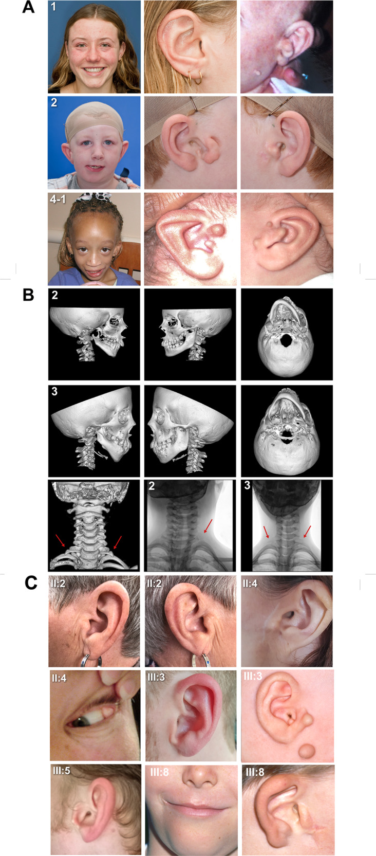 Fig. 2. Clinical Images of Individuals with SF3B2 haploinsufficiency.A. Photographs of three individuals demonstrating the shared phenotype. Proband 1 (c.2329dupG) demonstrates mandibular hypoplasia on the left, scar from preauricular skin tag excision on the right, and tragal duplication and facial skin tag on the left side prior to removal. Proband 2 (c.1780-2 A > -) demonstrates maxillary and mandibular hypoplasia on the right side in addition to bilateral tragal abnormalities. Proband 4-1 (c. 1608dupG) presented with maxillary and mandibular hypoplasia and tragal abnormality on the left side, and bilateral preauricular tags. B. Three-dimensional (3D) computed tomography (CT) reconstructions of the craniofacial skeleton of probands 2 and 3. Frontal, lateral, and submental views demonstrate maxillary and mandibular hypoplasia with resulting facial asymmetry. The third row demonstrates, from left to right, 3D CT scans of the cervical spine of Proband 1 and X-rays of Proband 2 and 3. Arrows in each figure indicate the cervical ribs. C. Photographs of family members with a shared SF3B2 startloss variant (p.M1?) demonstrating variable external ear phenotypes. Images of II:2 demonstrate a right ear markedly smaller than the left. Images of II:4 demonstrate a tragal abnormality and scar from prior preauricular skin tag removal, in addition to an epibulbar dermoid. III:3 presented with bilateral tragal abnormalities and tags (right side ear photo from childhood). Images of III:5 show an underdeveloped tragus. III:8 had tragal abnormality, scar from tag excision, right lateral oral cleft, and chin deviation due to mandibular hypoplasia.