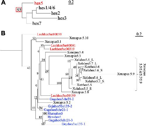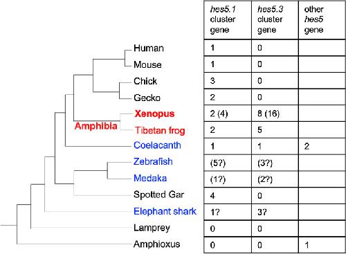 Evolution of hes gene family in vertebrates: the hes5 cluster genes have specifically increased in frogs.