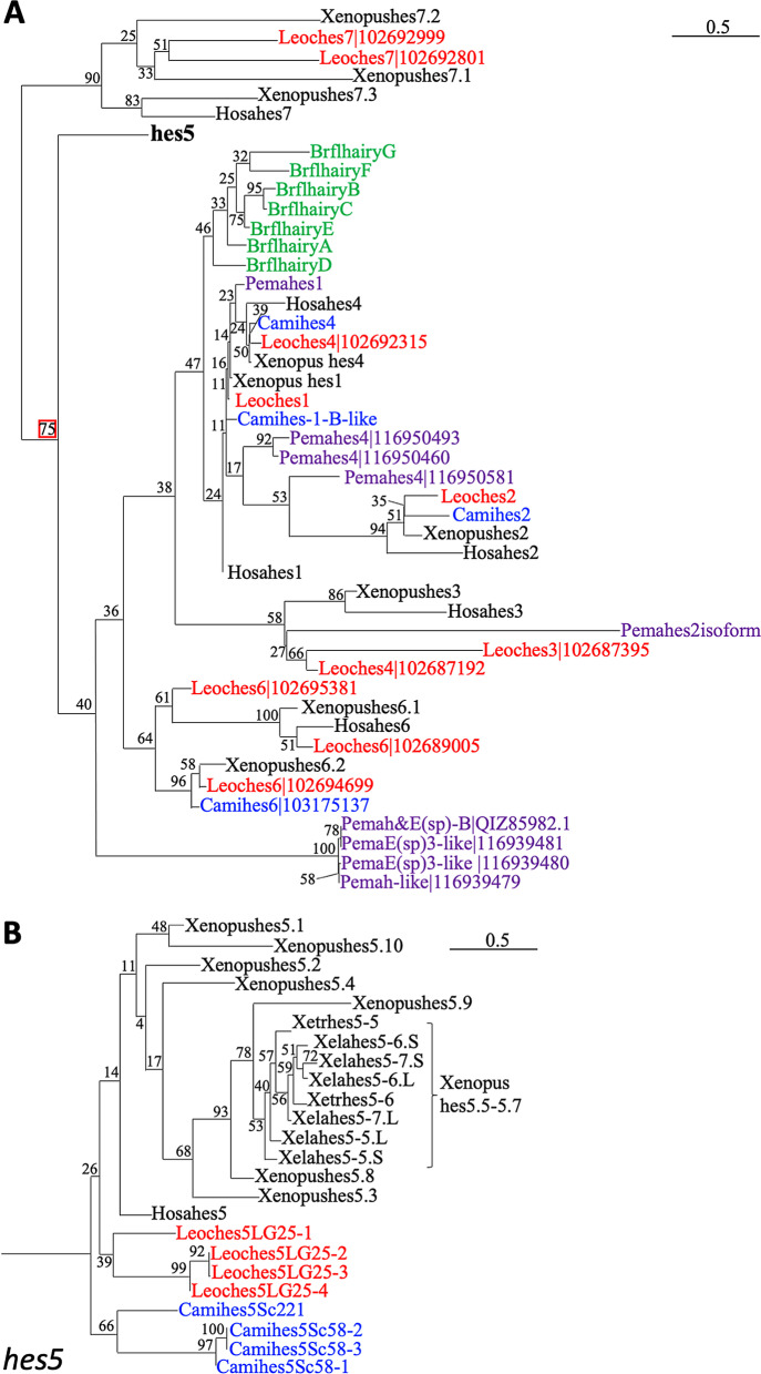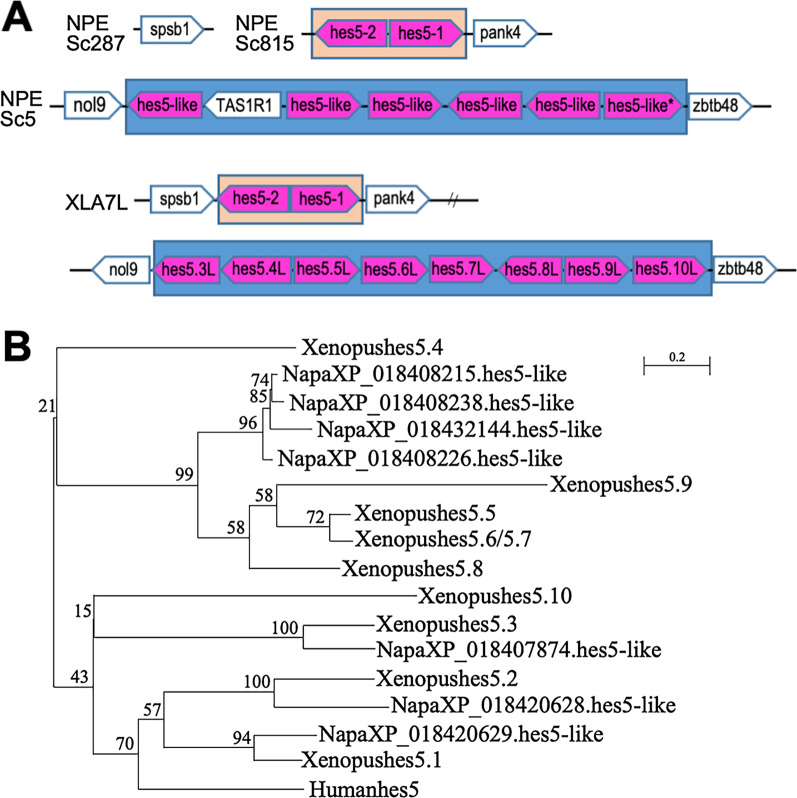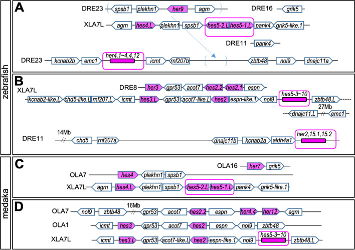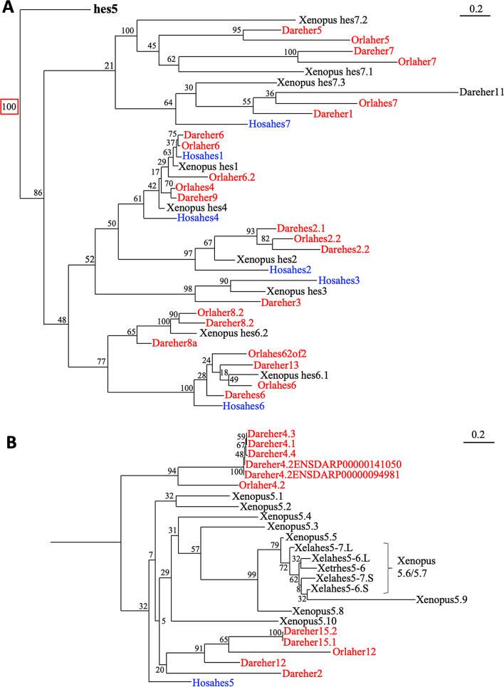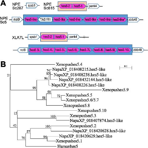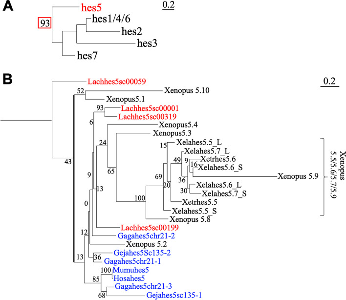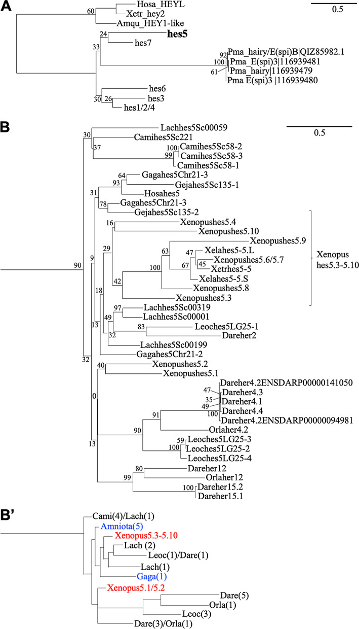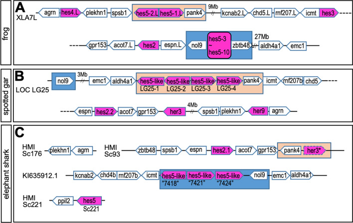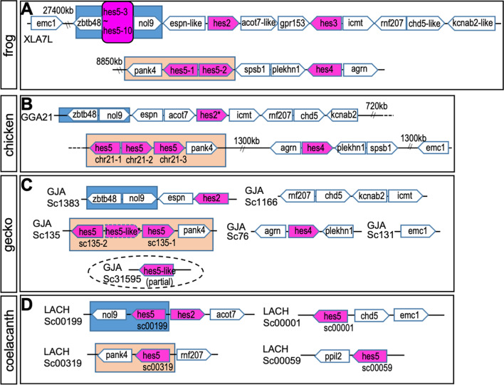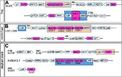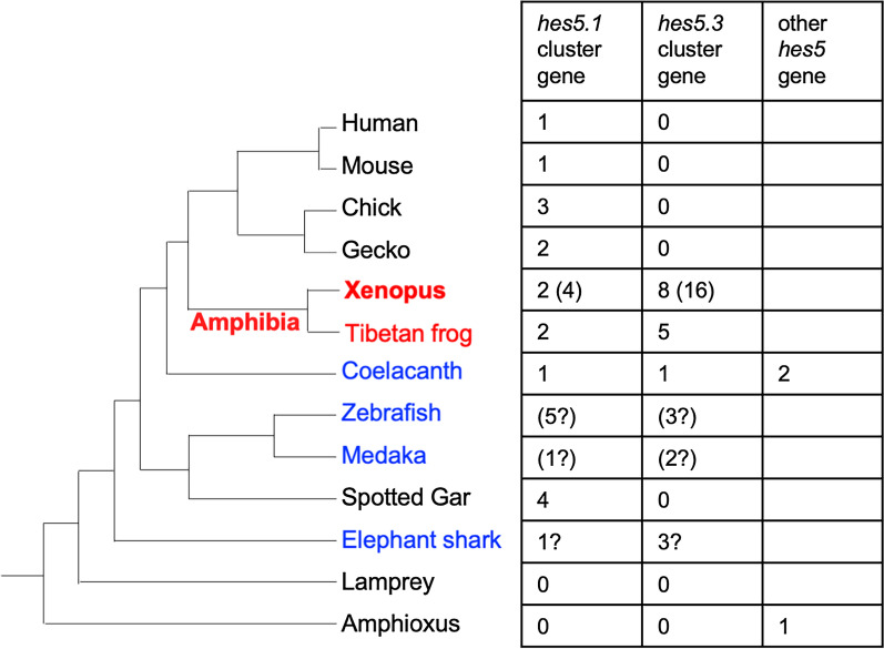 BACKGROUND: hes genes are chordate homologs of Drosophila genes, hairy and enhancer of split, which encode a basic helix-loop-helix (bHLH) transcriptional repressor with a WRPW motif. Various developmental functions of hes genes, including early embryogenesis and neurogenesis, have been elucidated in vertebrates. However, their orthologous relationships remain unclear partly because of less conservation of relatively short amino acid sequences, the fact that the genome was not analyzed as it is today, and species-specific genome duplication. This results in complicated gene names in vertebrates, which are not consistent in orthologs. We previously revealed that Xenopus frogs have two clusters of hes5, named "the hes5.1 cluster" and "the hes5.3 cluster", but the origin and the conservation have not yet been revealed. RESULTS: Here, we elucidated the orthologous and paralogous relationships of all hes genes of human, mouse, chicken, gecko, zebrafish, medaka, coelacanth, spotted gar, elephant shark and three species of frogs, Xenopus tropicalis (X. tropicalis), X. laevis, Nanorana parkeri, by phylogenetic and synteny analyses. Any duplicated hes5 were not found in mammals, whereas hes5 clusters in teleost were conserved although not as many genes as the three frog species. In addition, hes5 cluster-like structure was found in the elephant shark genome, but not found in cyclostomata. CONCLUSION: These data suggest that the hes5 cluster existed in the gnathostome ancestor but became a single gene in mammals. The number of hes5 cluster genes were specifically large in frogs.