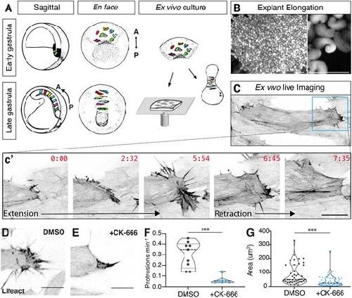 Figure 1. Lamellipodia in the Xenopus DMZ. (A) Schematic showing CE cell movements and DMZ explant method. Cells are unpolarized at the start of gastrulation and over time take on a bipolar polarity and intercalate to form a longer, narrower array. (B) Image showing elongated DMZ explants, close-up is shown at right. Scale bars: 1 mm. (C) Still from time-lapse confocal microscopy showing a single round of lamellipodial extension and retraction from the mediolateral end of a single DMZ cell. (D) DMSO does not affect DMZ lamellipodia. (E) Typical effect of CK-666 on DMZ lamellipodia. (F) Quantification of effects of CK-666 on protrusion frequency. n=9 DMSO protrusions from four embryos; n=7 CK666 protrusions from three embryos. ***P<0.001 for DMSO vs CK-666 (Mann–Whitney U-test). (G) Quantification of effects of CK-666 on protrusion size. n=43 DMSO-treated protrusions from four embryos, n=49 CK-666-treated protrusions from three embryos. ***P<0.001 for DMSO vs CK-666 (Mann–Whitney U-test). Graphs in F, G are violin plots with the median being highlighted by a dashed line and quartiles with dotted lines. Scale bars: 10 μm. |