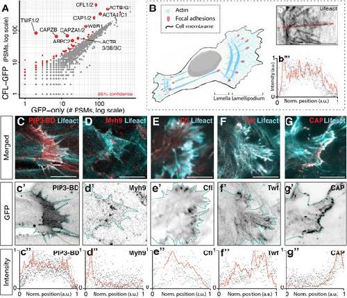 Figure 2. Localization of lamellipodial markers. (A) Interaction partners of Cfl2 were identified based on their enrichment in APMS of the Cfl2–GFP-tagged bait protein (vertical axes) relative to APMS of the untagged GFP controls (horizontal axes). Confidence values were calculated by one-sided Z-test (see Materials and Methods). A pseudocount of 1 PSM was added to each protein for visualization on a log–log plot. (B) Schematic showing the quantification scheme used here. b″, red dotted line indicates line-plot measurement taken along protrusion length; b‴, trace of actin intensity along protrusion length. Red line highlights one example trace, black dots are representative of several line plots. a.u., arbitrary units. (C,c′,c″) Pip3 localization and quantification; LifeAct in the alternate channel reports actin localization. (D,d′,d″) Myh9 localization and quantification. (E,e′,e″) Localization and quantification of Cfl2; LifeAct in the alternate channel reports actin localization. (F,f′,f″) Localization and quantification of Twf1. (G,g′,g″) Localization and quantification of Cap2. Dashed lines highlight cell edges. au, arbitrary units. Images shown are representative of at least three experiments. Scale bars: 10 μm. |