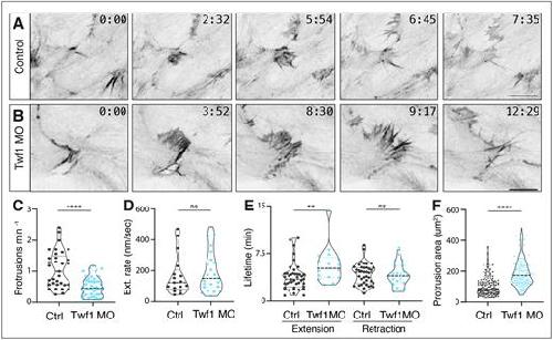 Figure 5. Twf1 controls lamellipodial dynamics in the Xenopus DMZ. (A,B) Confocal images of single cells in a LifeAct–GFP-expressing control and Twf1 morphant DMZ. Scale bars: 10 μm. (C) Quantification of lamellipodial protrusion frequency for control and Twf1 morphants. Control versus Twf1 morphant, n=33 control protrusions from two embryos; DMSO, n=44 Twf1 morphant protrusions from four embryos. ****P<0.0001 (Mann–Whitney U-test). (D) Quantification of lamellipodial extension rate. n=17 control protrusions from four embryos; n=23 Twf1 morphant protrusions from five embryos. n.s., not significant for control vs Twf1 morphant (P=0.516; Mann–Whitney U-test). (E) Quantification of lamellipodial extension and retraction lifetimes. n=42 control protrusions from four embryos; n=22 Twf1 morphant protrusions from six embryos. **P<0.01 for control vs Twf1 morphant, extension lifetime; n.s., not significant, for control vs Twf1 morphant retraction lifetime (Mann–Whitney U-test). (F) Quantification of lamellipodial area for control and Twf1 morphants. n=144 control protrusions from three embryos, n=127 Twf1 morphant protrusions from six embryos. ****P<0.0001 for control vs Twf1 morphant (Mann–Whitney U-test). Graphs in C–F are violin plots with the median being highlighted by a dashed line and quartile with dotted lines. |