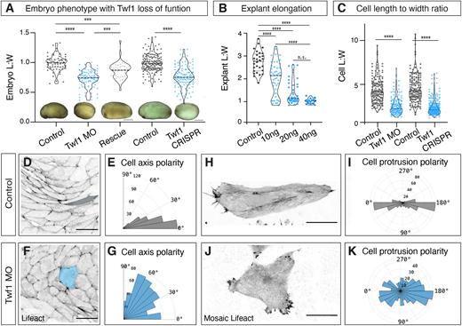 Figure 3. Twf1 is required for axis elongation and convergent extension. (A) Quantification of axis elongation (as length/width ratio) for control, Twf1 morphants, and Twf1 mRNA rescued embryos, along with sgRNA control and Twf1 crispants (inset images show representative examples; see more embryos in Fig. S3C), n=60 control embryos, n=88 morphant embryos, n=43 rescue embryos, n=155 sgRNA control, n=119 Twf1 Crispr. ***P<0.001; ****P<0.0001; n.s., not significant (Kruskal–Wallis test). Scale bars: 1 mm. (B) Quantification of explant elongation (as length/width ratio) for isolated DMZs from control and Twf1 morphant embryos. n=28, control; n=46, 10 ng; n=41, 20 ng; n=17, 40 ng. ****P<0.0001 for control vs 10 ng, 20 ng, 40 ng, n.s., not significant (P=0.0966) for 20 ng versus 40 ns (one-way Kruskal–Wallis test). (C) Quantification of cell shapes for control versus Twf1 morphant, and sgRNA control and Twf1 crispant DMZs. n=168 control cells from six embryos, n=156 Twf1 morphant cells from six embryos, n=169 sgRNA control cells from 11 embryos, n=294 Twf1 Crispr cells from 14 embryos, three experiments (representative images in Fig. S3C). ****P<0.0001 (Mann–Whitney U-test). Graphs in A–C are violin plots with the median being highlighted by a dashed line and quartiles with dotted lines. (D,E) Representative image (D) and rose diagram (E) showing quantification of cell axis polarity in control DMZ. Scale bar: 50 μm. (F,G) Representative image (F) and rose diagram (G) showing disrupted cell axis polarity in Twf1 morphant. Scale bar: 50 μm. E,G shows control vs Twf1 morphant, n=387 control cells from nine embryos, n=522 Twf1 morphant cells from 15 embryos. P<0.0001 (Kolmogorov–Smirnov test). (H) Confocal image of mosaically labeled cell in control DMZ. Scale bar: 10 μm. (I) Rose diagram showing the normal mediolateral polarization of lamellipodia in the control DMZ. (J) Confocal image of mosaically labeled cell in Twf1 morphant DMZ. Scale bar: 10 μm. (K) Rose diagram showing the disrupted mediolateral polarization of lamellipodia in the morphant. I,K show control vs Twf1 morphant, n=119 control protrusions from five embryos, n=194 Twf1 morphant protrusions from nine embryos. P<0.0001 (Kolmogorov–Smirnov test). |
